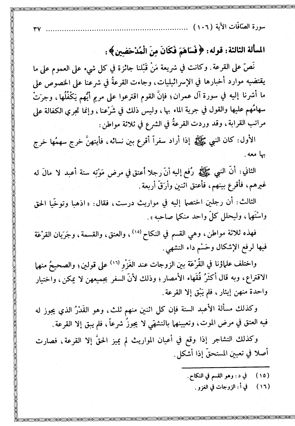 الْمَسْأَلَةُ الثَّالِثَةُ قَوْلُهُ: {فَسَاهَمَ فَكَانَ مِنَ الْمُدْحَضِينَ} [الصافات: 141] نَصٌّ عَلَى الْقُرْعَةِ. وَكَانَتْ فِي شَرِيعَةِ مَنْ قَبْلَنَا جَائِزَةً فِي كُلِّ شَيْءٍ عَلَى الْعُمُومِ عَلَى مَا يَقْتَضِيهِ مَوَارِدُ أَخْبَارِهَا فِي الْإِسْرَائِيلِيَّات، وَجَاءَتْ الْقُرْعَةُ فِي شَرْعِنَا عَلَى الْخُصُوصِ عَلَى مَا أَشَرْنَا إلَيْهِ فِي سُورَةِ آلِ عِمْرَانَ؛ فَإِنَّ الْقَوْمَ اقْتَرَعُوا عَلَى مَرْيَمَ أَيُّهُمْ يَكْفُلُهَا، وَجَرَتْ سِهَامُهُمْ عَلَيْهَا وَالْقَوْلُ فِي جَرْيَةِ الْمَاءِ بِهَا، وَلَيْسَ ذَلِكَ فِي شَرْعِنَا، وَإِنَّمَا تَجْرِي الْكَفَالَةُ عَلَى مَرَاتِبِ الْقَرَابَةِ، وَقَدْ وَرَدَتْ الْقُرْعَةُ فِي الشَّرْعِ فِي ثَلَاثَةِ مَوَاطِنَ: الْأَوَّلُ «كَانَ النَّبِيُّ - صَلَّى اللَّهُ عَلَيْهِ وَسَلَّمَ - إذَا أَرَادَ سَفَرًا أَقْرَعَ بَيْنَ نِسَائِهِ، فَأَيَّتُهُنَّ خَرَجَ سَهْمُهَا خَرَجَ بِهَا مَعَهُ».
