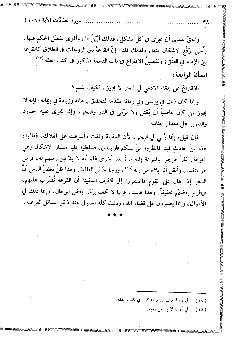 فَإِنْ قِيلَ: إنَّمَا رُمِيَ فِي الْبَحْرِ، لِأَنَّ السَّفِينَةَ وَقَفَتْ وَأَشْرَفَتْ عَلَى الْهَلَاكِ، فَقَالُوا: هَذَا مِنْ حَادِثٍ فِينَا فَانْظُرُوا مَنْ بَيْنَكُمْ فَلَمْ يَتَعَيَّنْ، فَسَلَّطُوا عَلَيْهِ مِسْبَارَ الْإِشْكَالِ وَهِيَ الْقُرْعَةُ، فَلَمَّا خَرَجُوا بِالْقُرْعَةِ إلَيْهِ مَرَّةً بَعْدَ أُخْرَى عَلِمَ أَنَّهُ لَا بُدَّ مِنْ رَمْيِهِمْ لَهُ، فَرَمَى هُوَ بِنَفْسِهِ، وَأَيْقَنَ أَنَّهُ بَلَاءٌ مِنْ رَبِّهِ وَرَجَا حُسْنَ الْعَاقِبَةِ، وَلِهَذَا ظَنَّ بَعْضُ النَّاسِ أَنَّ الْبَحْرَ إذَا هَالَ عَلَى الْقَوْمِ فَاضْطُرُّوا إلَى تَخْفِيفِ السَّفِينَةِ أَنَّ الْقُرْعَةَ تُضْرَبُ عَلَيْهِمْ، فَيُطْرَحُ بَعْضُهُمْ تَخْفِيفًا.