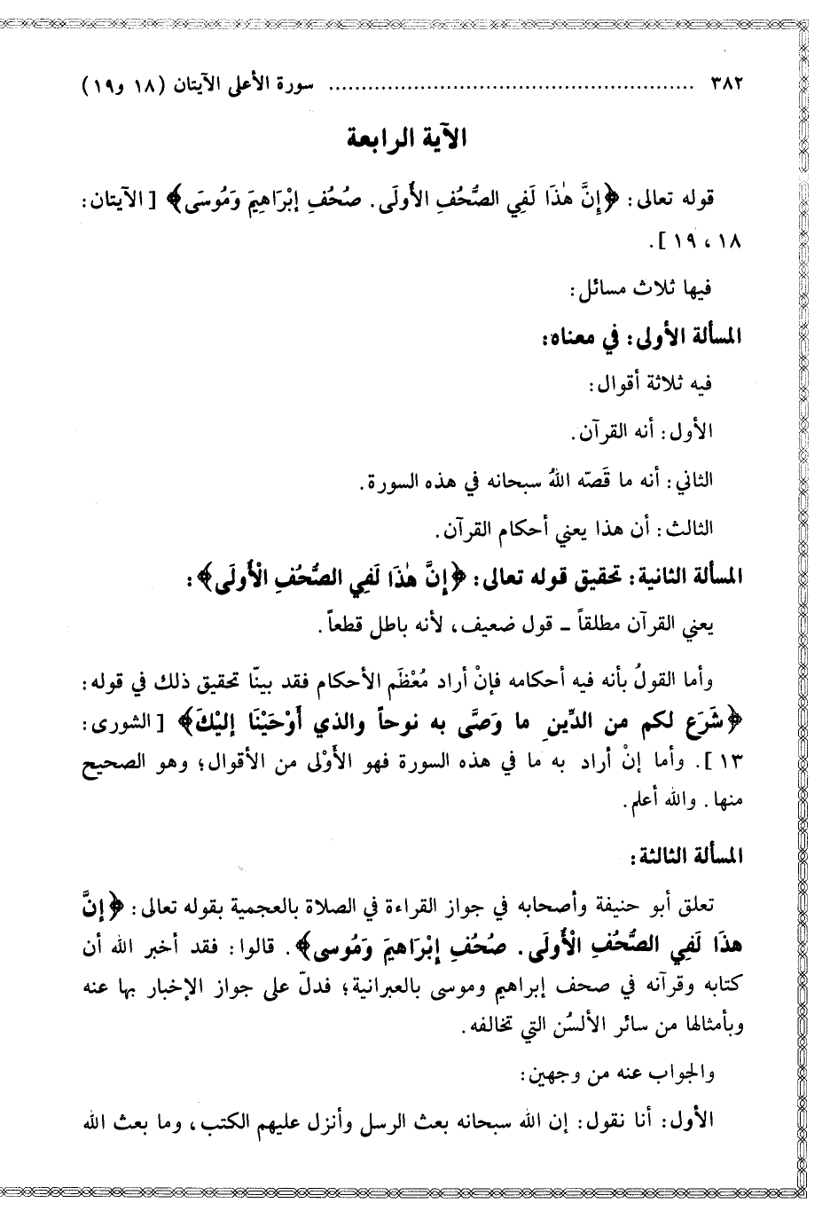 الْمَسْأَلَةُ الثَّانِيَةُ تَحْقِيقُ قَوْله تَعَالَى: {إِنَّ هَذَا لَفِي الصُّحُفِ الأُولَى} [الأعلى: 18] يَعْنِي الْقُرْآنَ مُطْلَقًا قَوْلٌ ضَعِيفٌ؛ لِأَنَّهُ بَاطِلٌ قَطْعًا.