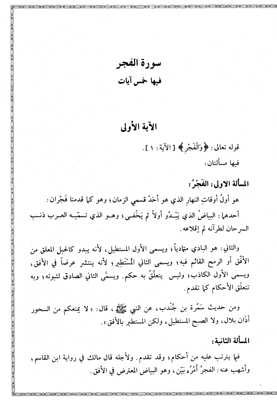 ٍ] الْآيَةُ الْأُولَى قَوْله تَعَالَى: {وَالْفَجْرِ} [الفجر: 1]: فِيهَا مَسْأَلَتَانِ:.