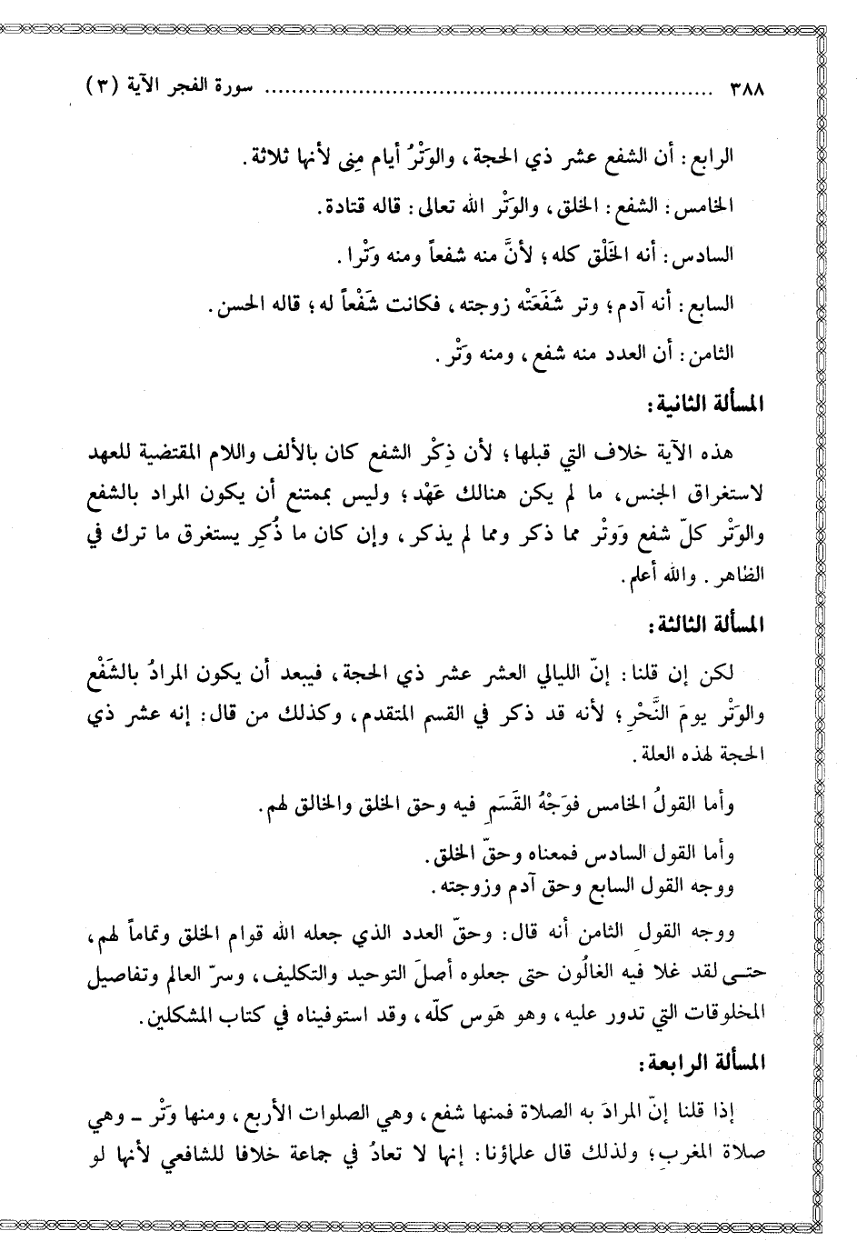 الْمَسْأَلَةُ الثَّالِثَةُ لَكِنْ إنْ قُلْنَا: إنَّ اللَّيَالِيَ الْعَشْرَ عَشْرُ ذِي الْحِجَّةِ، فَيَبْعُدُ أَنْ يَكُونَ الْمُرَادُ بِالشَّفْعِ وَالْوَتْرِ يَوْمَ النَّحْرِ؛ لِأَنَّهُ قَدْ ذُكِرَ فِي الْقِسْمِ الْمُتَقَدِّمِ، وَكَذَلِكَ مَنْ قَالَ: إنَّهُ عَشْرُ ذِي الْحِجَّةِ لِهَذِهِ الْعِلَّةِ.