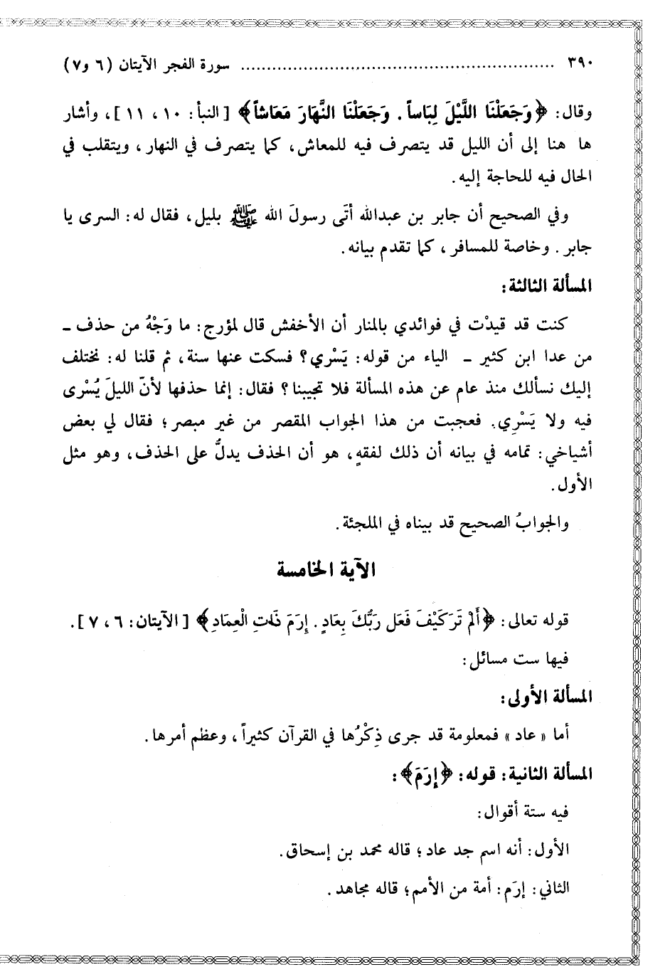 الْآيَةُ الْخَامِسَةُ قَوْله تَعَالَى: {أَلَمْ تَرَ كَيْفَ فَعَلَ رَبُّكَ بِعَادٍ} [الفجر: 6] {إِرَمَ ذَاتِ الْعِمَادِ} [الفجر: 7]: فِيهَا سِتُّ مَسَائِلَ: