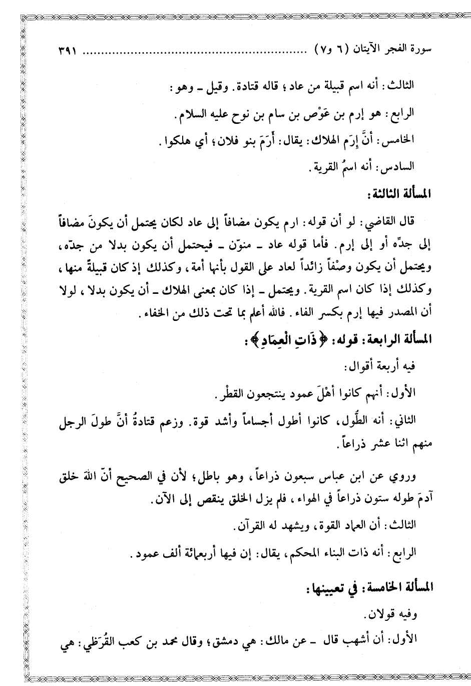 الْمَسْأَلَةُ الثَّالِثَةُ قَالَ الْقَاضِي: لَوْ أَنَّ قَوْلَهُ: إرَمَ يَكُونُ مُضَافًا إلَى عَادٍ لَكَانَ يُحْتَمَلُ أَنْ يَكُونَ مُضَافًا إلَى جَدِّهِ أَوْ إلَى إرَمَ. فَأَمَّا قَوْلُهُ عَادٌ مُنَوَّنٌ فَيُحْتَمَلُ أَنْ يَكُونَ بَدَلًا مِنْ جَدِّهِ، وَيُحْتَمَلُ أَنْ يَكُونَ وَصْفًا زَائِدًا لِعَادٍ عَلَى الْقَوْلِ بِأَنَّهَا أُمَّةٌ، وَكَذَلِكَ إذَا كَانَ قَبِيلَةً مِنْهَا، وَكَذَلِكَ إذَا كَانَ اسْمَ الْقَرْيَةِ. وَيُحْتَمَلُ إذَا كَانَ بِمَعْنَى الْهَلَاكِ أَنْ يَكُونَ بَدَلًا، لَوْلَا أَنَّ الْمَصْدَرَ فِيهَا إرْمٌ بِكَسْرِ الْفَاءِ. فَاَللَّهُ أَعْلَمُ بِمَا تَحْتَ ذَلِكَ مِنْ الْخَفَاءِ.