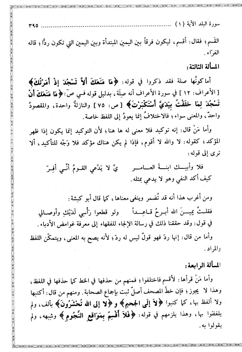 الْمَسْأَلَةُ الرَّابِعَةُ وَأَمَّا مَنْ قَرَأَهَا: لَأُقْسِمُ فَاخْتَلَفُوا؛ فَمِنْهُمْ مَنْ حَذَفَهَا فِي الْخَطِّ كَمَا حَذَفَهَا فِي اللَّفْظِ، وَهَذَا لَا يَجُوزُ؛ فَإِنَّ خَطَّ الْمُصْحَفِ أَصْلٌ ثَبَتَ بِإِجْمَاعِ الصَّحَابَةِ. وَمِنْهُمْ مَنْ قَالَ: أَكْتُبُهَا وَلَا أَلْفِظُ بِهَا، كَمَا كَتَبُوا " لَا إلَى الْجَحِيمِ ". و " لَا إلَى اللَّهِ تُحْشَرُونَ " بِأَلِفٍ، وَلَمْ يَلْفِظُوا بِهَا، وَهَذَا يَلْزَمُهُمْ فِي قَوْلِهِ: {فَلا أُقْسِمُ بِمَوَاقِعِ النُّجُومِ} [الواقعة: 75] وَشِبْهِهِ، وَلَمْ يَقُولُوا بِهِ.