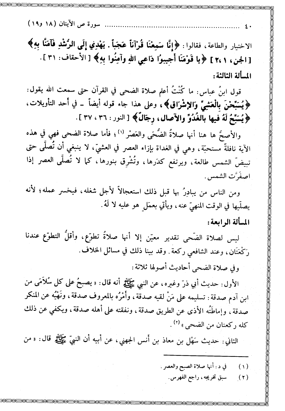 الْمَسْأَلَةُ الثَّالِثَةُ قَالَ ابْنُ عَبَّاسٍ: مَا كُنْت أَعْلَمُ صَلَاةَ الضُّحَى فِي الْقُرْآنِ حَتَّى سَمِعْت اللَّهَ يَقُولُ {يُسَبِّحْنَ بِالْعَشِيِّ وَالإِشْرَاقِ} [ص: 18] وَعَلَى هَذَا جَاءَ قَوْلُهُ أَيْضًا فِي أَحَدِ التَّأْوِيلَاتِ، {يُسَبِّحُ لَهُ فِيهَا بِالْغُدُوِّ وَالآصَالِ} [النور: 36] {رِجَالٌ} [النور: 37]