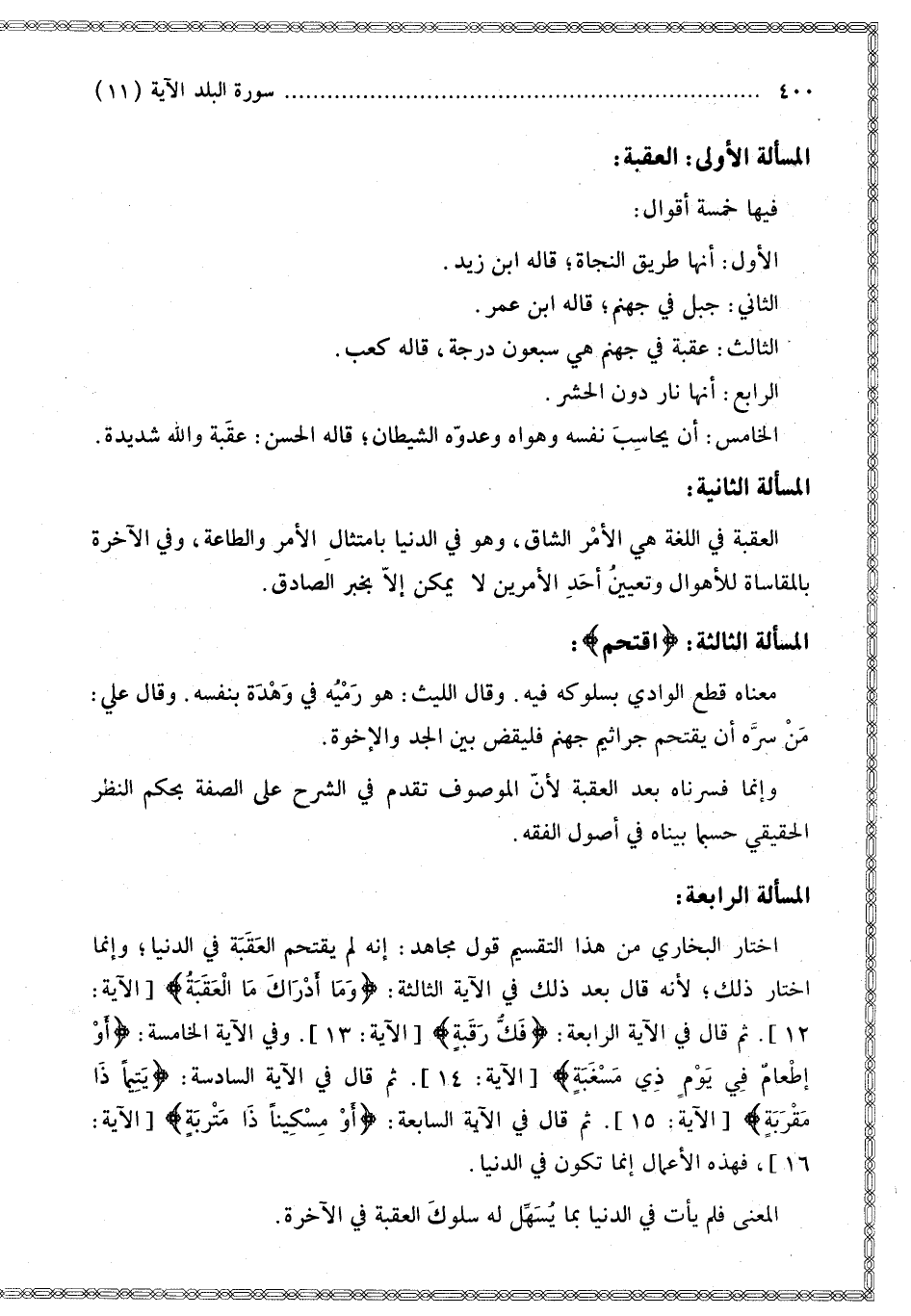 الْمَسْأَلَةُ الْأُولَى الْعَقَبَةُ: فِيهَا خَمْسَةُ أَقْوَالٍ: الْأَوَّلُ: أَنَّهَا طَرِيقُ النَّجَاةِ؛ قَالَهُ ابْنُ زَيْدٍ. الثَّانِي جَبَلٌ فِي جَهَنَّمَ؛ قَالَهُ ابْنُ عُمَرَ. الثَّالِثُ: عَقَبَةٌ فِي جَهَنَّمَ هِيَ سَبْعُونَ دَرَجَةً، قَالَهُ كَعْبٌ. الرَّابِعُ أَنَّهَا نَارٌ دُونَ الْحَشْرِ. الْخَامِسُ أَنْ يُحَاسِبَ نَفْسَهُ وَهَوَاهُ وَعَدُوَّهُ الشَّيْطَانَ؛ قَالَهُ الْحَسَنُ: عَقَبَةٌ وَاَللَّهِ شَدِيدَةٌ.