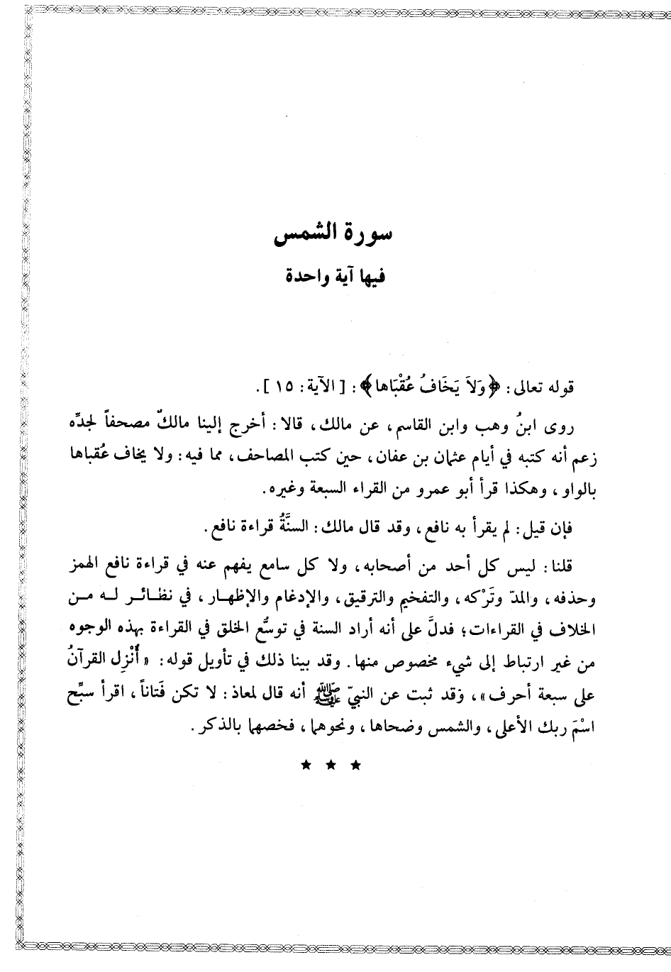 ٌ] قَوْله تَعَالَى: {وَلا يَخَافُ عُقْبَاهَا} [الشمس: 15]: رَوَى ابْنُ وَهْبٍ وَابْنُ الْقَاسِمِ عَنْ مَالِكٍ قَالَا: أَخْرَجَ إلَيْنَا مَالِكٌ مُصْحَفًا لِجَدِّهِ زَعَمَ أَنَّهُ كَتَبَهُ فِي أَيَّامِ عُثْمَانَ بْنِ عَفَّانَ، حِينَ كَتَبَ الْمَصَاحِفَ، مِمَّا فِيهِ: وَلَا يَخَافُ عُقْبَاهَا بِالْوَاوِ، وَهَكَذَا قَرَأَ أَبُو عَمْرٍو مِنْ الْقُرَّاءِ السَّبْعَةِ وَغَيْرُهُ.