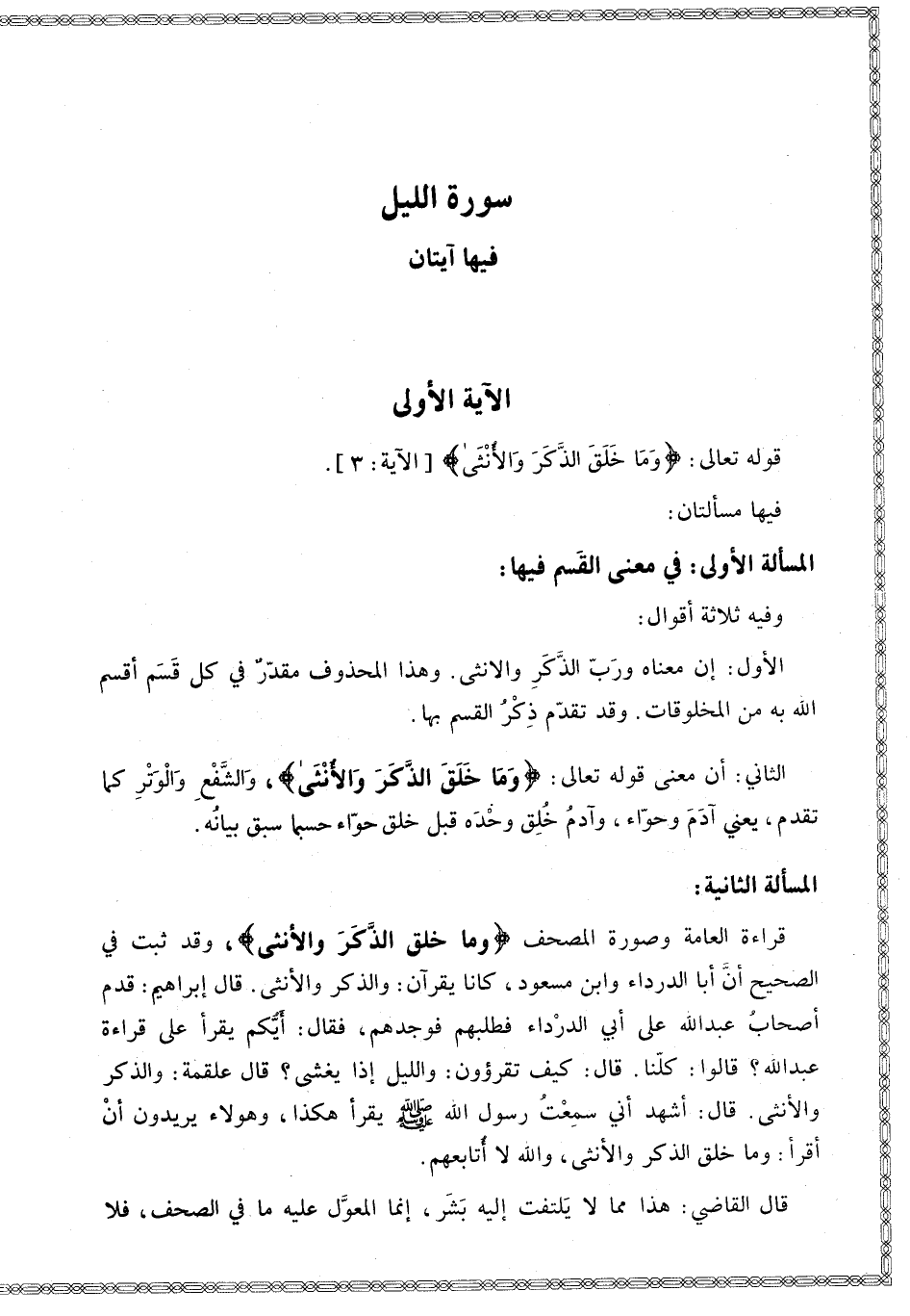 الْمَسْأَلَةُ الثَّانِيَةُ قِرَاءَةُ الْعَامَّةِ وَصُورَةُ الْمُصْحَفِ {وَمَا خَلَقَ الذَّكَرَ وَالأُنْثَى} [الليل: 3] وَقَدْ ثَبَتَ فِي الصَّحِيحِ أَنَّ أَبَا الدَّرْدَاءِ وَابْنَ مَسْعُودٍ، كَانَا يَقْرَآنِ: وَالذَّكَرِ وَالْأُنْثَى. قَالَ إبْرَاهِيمُ: قَدِمَ أَصْحَابُ عَبْدِ اللَّهِ عَلَى أَبِي الدَّرْدَاءِ فَطَلَبَهُمْ فَوَجَدَهُمْ، فَقَالَ: أَيُّكُمْ يَقْرَأُ عَلَى قِرَاءَةِ عَبْدِ اللَّهِ؟ قَالُوا: كُلُّنَا. قَالَ تَقْرَءُونَ: {وَاللَّيْلِ إِذَا يَغْشَى} [الليل: 1]؟ قَالَ عَلْقَمَةُ: وَالذَّكَرِ وَالْأُنْثَى. قَالَ: أَشْهَدُ أَنِّي سَمِعْت رَسُولَ اللَّهِ - صَلَّى اللَّهُ عَلَيْهِ وَسَلَّمَ - يَقْرَأُ هَكَذَا، وَهَؤُلَاءِ يُرِيدُونَ أَنْ أَقْرَأَ: وَمَا خَلَقَ الذَّكَرَ وَالْأُنْثَى، وَاَللَّهِ لَا أُتَابِعُهُمْ.