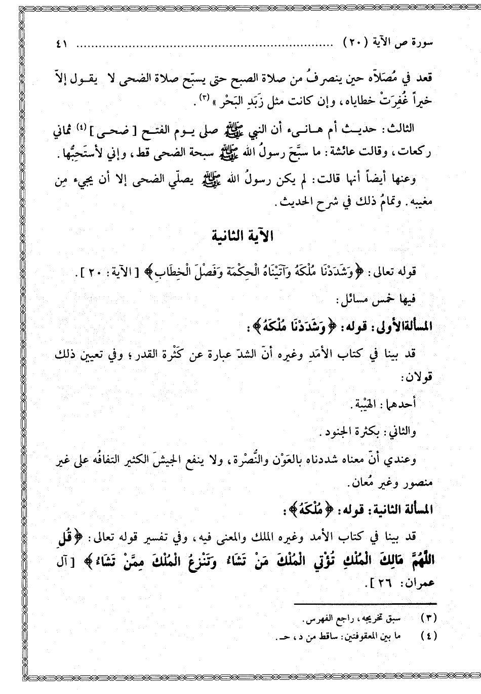 فِيهَا خَمْسُ مَسَائِلَ: الْمَسْأَلَةُ الْأُولَى قَوْلُهُ {وَشَدَدْنَا مُلْكَهُ} [ص: 20]: قَدْ بَيَّنَّا فِي كِتَابِ الْأَمَدِ وَغَيْرِهِ أَنَّ الشَّدَّ عِبَارَةٌ عَنْ كَثْرَةِ الْقَدْرِ؛ وَفِي تَعْيِينِ ذَلِكَ قَوْلَانِ: أَحَدُهُمَا الْهَيْبَةُ. وَالثَّانِي: بِكَثْرَةِ الْجُنُودِ. وَعِنْدِي أَنَّ مَعْنَاهُ شَدَدْنَاهُ بِالْعَوْنِ وَالنُّصْرَةِ، وَلَا يَنْفَعُ الْجَيْشُ الْكَثِيرُ الْتِفَافُهُ عَلَى غَيْرِ مَنْصُورٍ وَغَيْرِ مُعَانٍ.