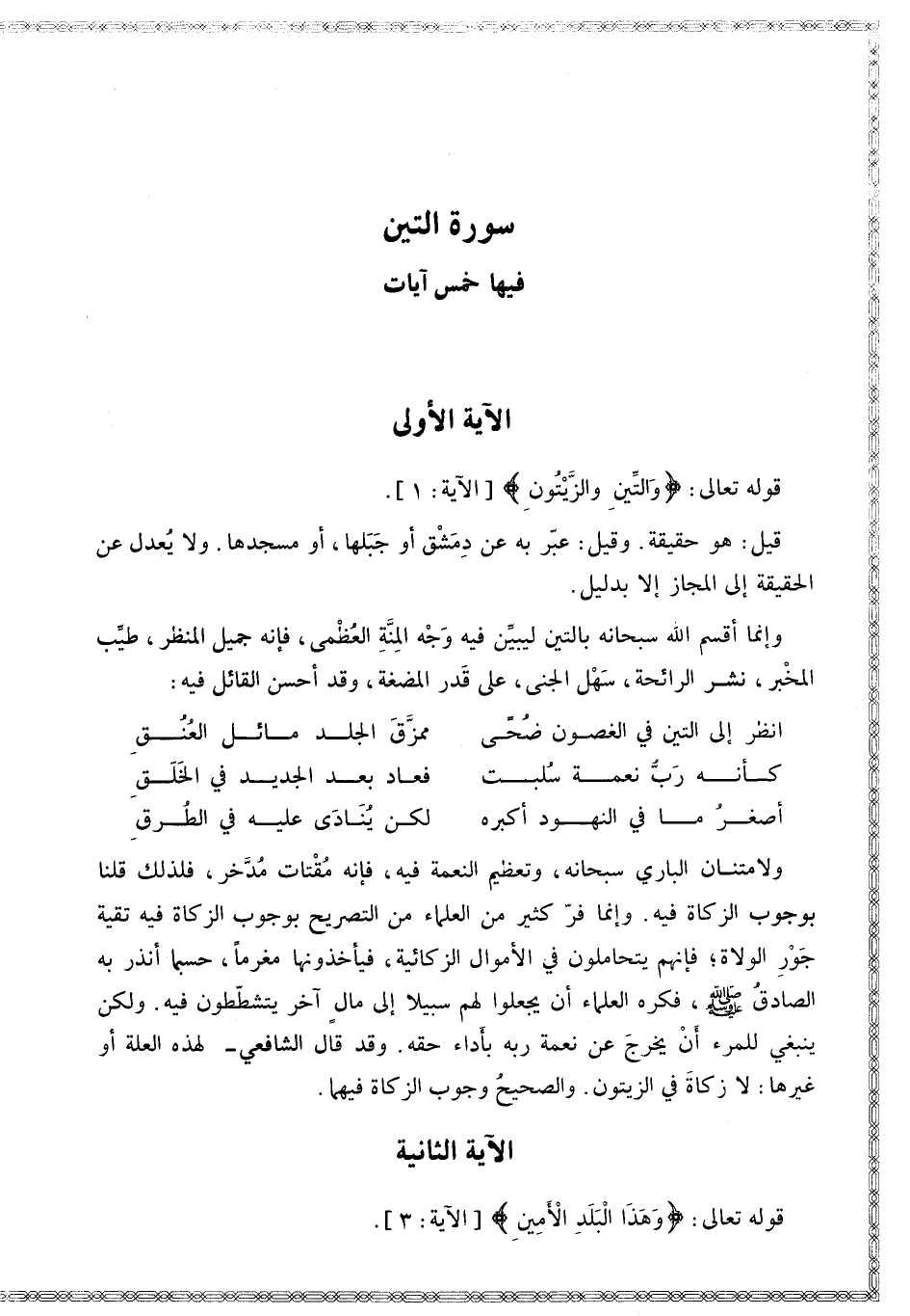 ٍ] الْآيَةُ الْأُولَى قَوْله تَعَالَى: {وَالتِّينِ وَالزَّيْتُونِ} [التين: 1]: قِيلَ: هُوَ حَقِيقَةٌ. وَقِيلَ: عَبَّرَ بِهِ عَنْ دِمَشْقَ أَوْ جَبَلِهَا، أَوْ مَسْجِدِهَا، وَلَا يُعْدَلُ عَنْ الْحَقِيقَةِ إلَى الْمَجَازِ إلَّا بِدَلِيلٍ.