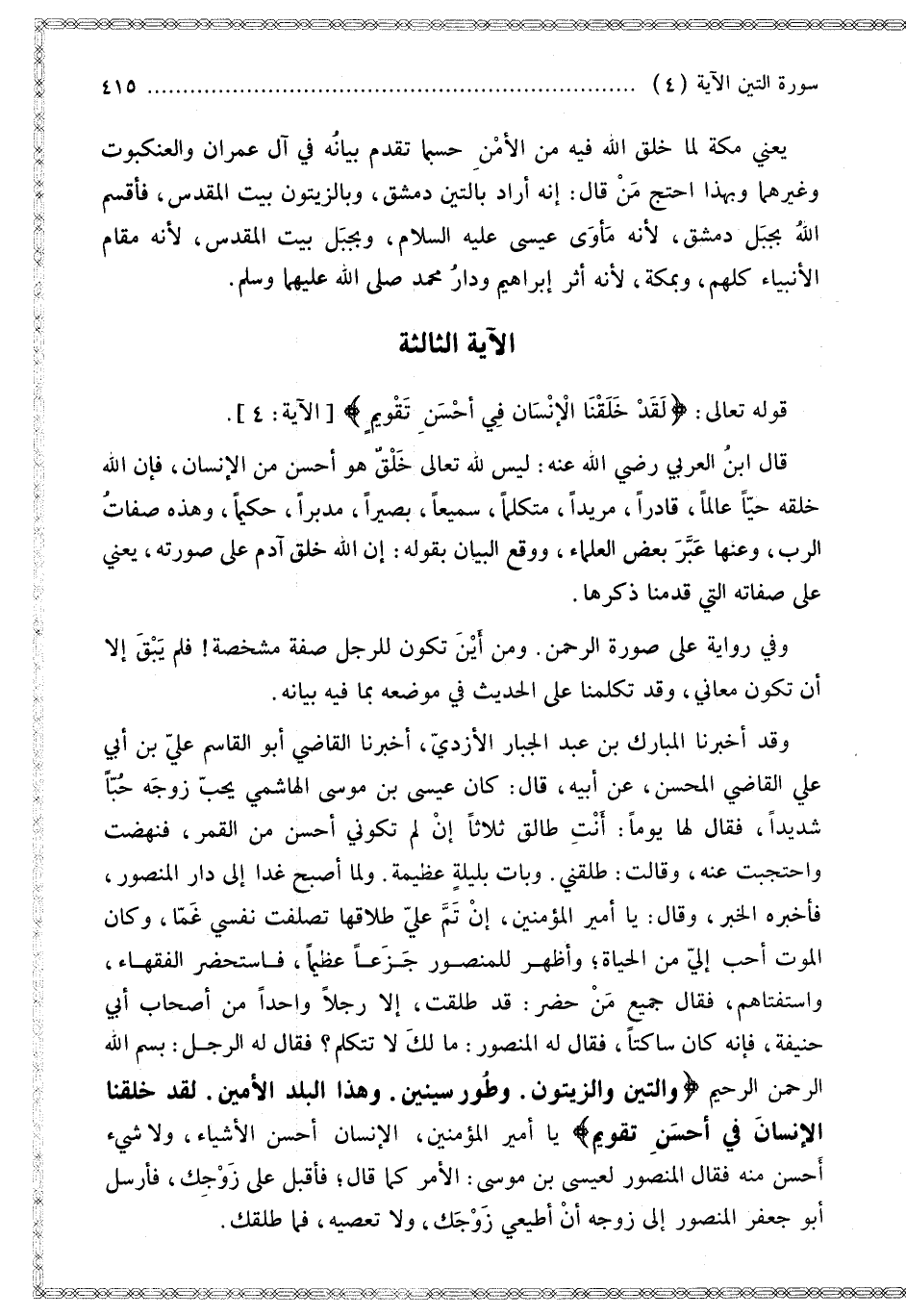 وَقَدْ أَخْبَرَنَا الْمُبَارَكُ بْنُ عَبْدِ الْجَبَّارِ الْأَزْدِيُّ، أَخْبَرَنَا الْقَاضِي أَبُو الْقَاسِمِ عَلِيُّ بْنُ أَبِي عَلِيٍّ الْقَاضِي الْمُحْسِنُ عَنْ أَبِيهِ قَالَ: كَانَ عِيسَى بْنُ مُوسَى الْهَاشِمِيُّ يُحِبُّ زَوْجَهُ حُبًّا شَدِيدًا قَالَ لَهَا يَوْمًا: أَنْتِ طَالِقٌ ثَلَاثًا إنْ لَمْ تَكُونِي أَحْسَنَ مِنْ الْقَمَرِ، فَنَهَضَتْ وَاحْتَجَبَتْ عَنْهُ، وَقَالَتْ: طَلَّقَنِي. وَبَاتَ بِلَيْلَةٍ عَظِيمَةٍ. وَلَمَّا أَصْبَحَ غَدًا إلَى دَارِ الْمَنْصُورِ، فَأَخْبَرَهُ الْخَبَرَ [وَقَالَ: يَا أَمِيرَ الْمُؤْمِنِينَ، إنْ تَمَّ عَلَيَّ طَلَاقُهَا تَصَلَّفَتْ نَفْسِي غَمًّا، وَكَانَ الْمَوْتُ أَحَبَّ إلَيَّ مِنْ الْحَيَاةِ]؛ وَأَظْهَرَ لِلْمَنْصُورِ جَزَعًا عَظِيمًا، فَاسْتَحْضَرَ الْفُقَهَاءَ، وَاسْتَفْتَاهُمْ، فَقَالَ جَمِيعُ مَنْ حَضَرَ: قَدْ طَلُقَتْ، إلَّا رَجُلًا وَاحِدًا مِنْ أَصْحَابِ أَبِي حَنِيفَةَ، فَإِنَّهُ كَانَ سَاكِتًا، فَقَالَ لَهُ الْمَنْصُورُ: مَالَك لَا تَتَكَلَّمُ؟ فَقَالَ لَهُ الرَّجُلُ: بِسْمِ اللَّهِ الرَّحْمَنِ الرَّحِيمِ. {وَالتِّينِ وَالزَّيْتُونِ} [التين: 1] {وَطُورِ سِينِينَ - وَهَذَا الْبَلَدِ الأَمِينِ} [التين: 2 - 3] {لَقَدْ خَلَقْنَا الإِنْسَانَ فِي أَحْسَنِ تَقْوِيمٍ} [التين: 4] يَا أَمِيرَ الْمُؤْمِنِينَ، الْإِنْسَانُ أَحْسَنُ الْأَشْيَاءِ، وَلَا شَيْءَ أَحْسَنُ مِنْهُ [فَقَالَ الْمَنْصُورُ لِعِيسَى بْنِ مُوسَى: الْأَمْرُ كَمَا قَالَ؛ فَأَقْبِلْ عَلَى زَوْجِك]، فَأَرْسَلَ أَبُو جَعْفَرٍ الْمَنْصُورُ إلَى زَوْجِهِ أَنْ أَطِيعِي زَوْجَك، وَلَا تَعْصِيهِ، فَمَا طَلَّقَك.