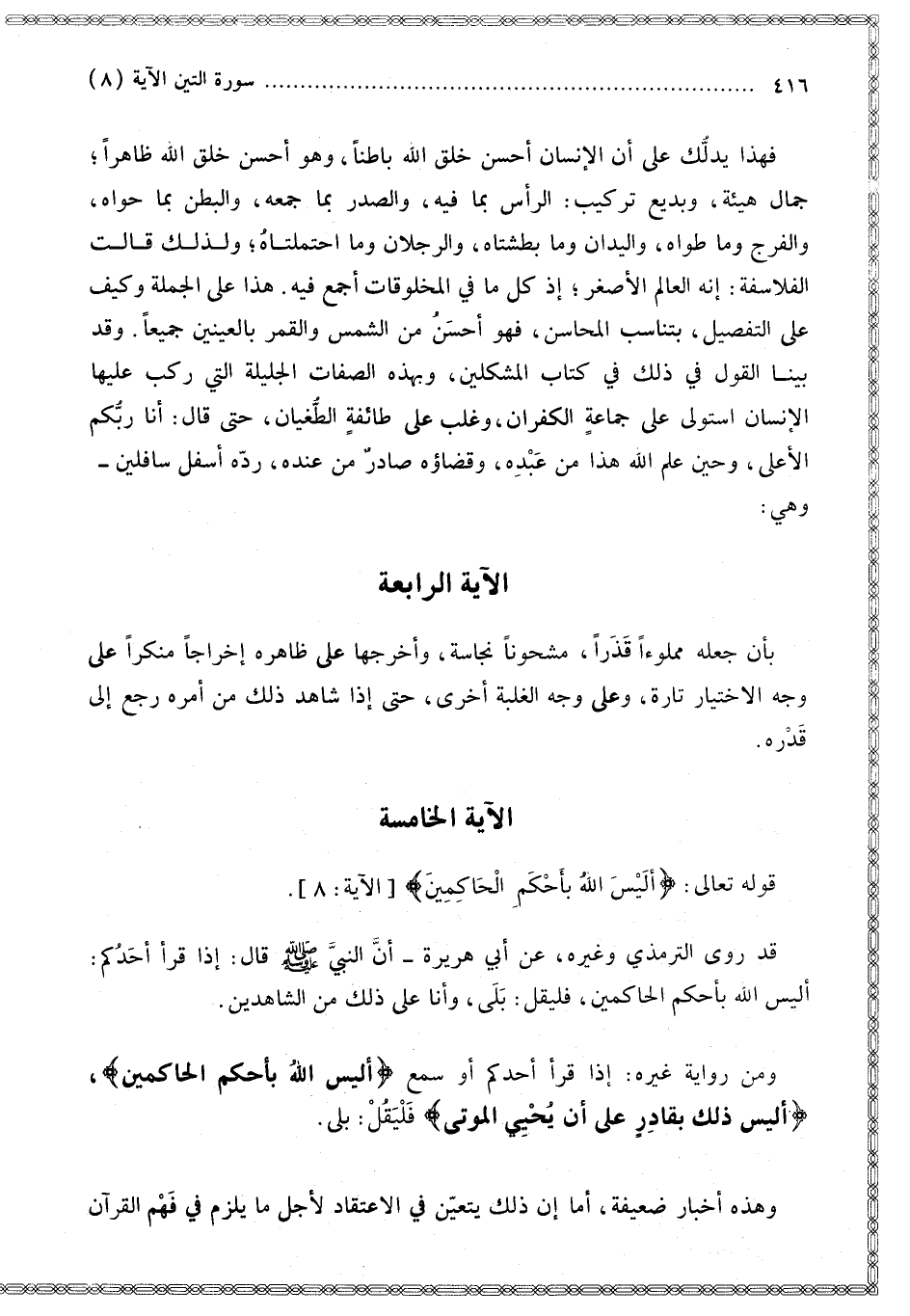 َ} [التين: 8]: قَدْ رَوَى التِّرْمِذِيُّ وَغَيْرُهُ عَنْ أَبِي هُرَيْرَةَ أَنَّ النَّبِيَّ - صَلَّى اللَّهُ عَلَيْهِ وَسَلَّمَ - قَالَ: «إذَا قَرَأَ أَحَدُكُمْ: {أَلَيْسَ اللَّهُ بِأَحْكَمِ الْحَاكِمِينَ} [التين: 8] فَلْيَقُلْ: بَلَى، وَأَنَا عَلَى ذَلِكَ مِنْ الشَّاهِدِينَ».