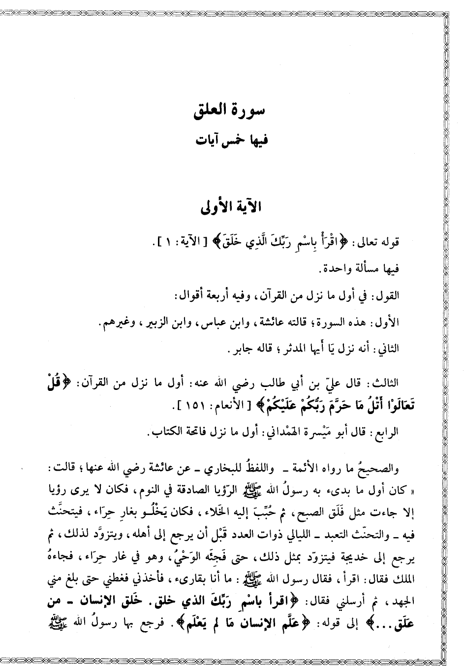 [سُورَةُ الْعَلَقِ فِيهَا خَمْسُ آيَاتٍ] [الْآيَةُ الْأُولَى قَوْله تَعَالَى اقْرَأْ بِاسْمِ رَبِّك الَّذِي خَلَقَ]