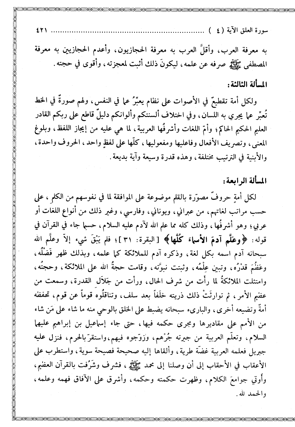 الْمَسْأَلَةُ الثَّالِثَةُ وَلِكُلِّ أُمَّةٍ تَقْطِيعٌ فِي الْأَصْوَاتِ عَلَى نِظَامٍ يُعَبِّرُ عَمَّا فِي النَّفْسِ، وَلَهُمْ صُورَةٌ فِي الْخَطِّ تُعَبِّرُ عَمَّا يَجْرِي بِهِ اللِّسَانُ، وَفِي اخْتِلَافِ أَلْسِنَتِكُمْ وَأَلْوَانِكُمْ دَلِيلٌ قَاطِعٌ عَلَى رَبِّكُمْ الْقَادِرِ الْعَلِيمِ الْحَكِيمِ الْحَاكِمِ؛ وَأُمُّ اللُّغَاتِ وَأَشْرَفُهَا الْعَرَبِيَّةُ، لِمَا هِيَ عَلَيْهِ مِنْ إيجَازِ اللَّفْظِ، وَبُلُوغِ الْمَعْنَى، وَتَصْرِيفِ الْأَفْعَالِ وَفَاعِلِيهَا وَمَفْعُولِيّهَا، كُلُّهَا عَلَى لَفْظٍ وَاحِدٍ، الْحُرُوفُ وَاحِدَةٌ، وَالْأَبْنِيَةُ فِي التَّرْتِيبِ مُخْتَلِفَةٌ، وَهَذِهِ قُدْرَةٌ وَسِيعَةٌ وَآيَةٌ بَدِيعَةٌ.