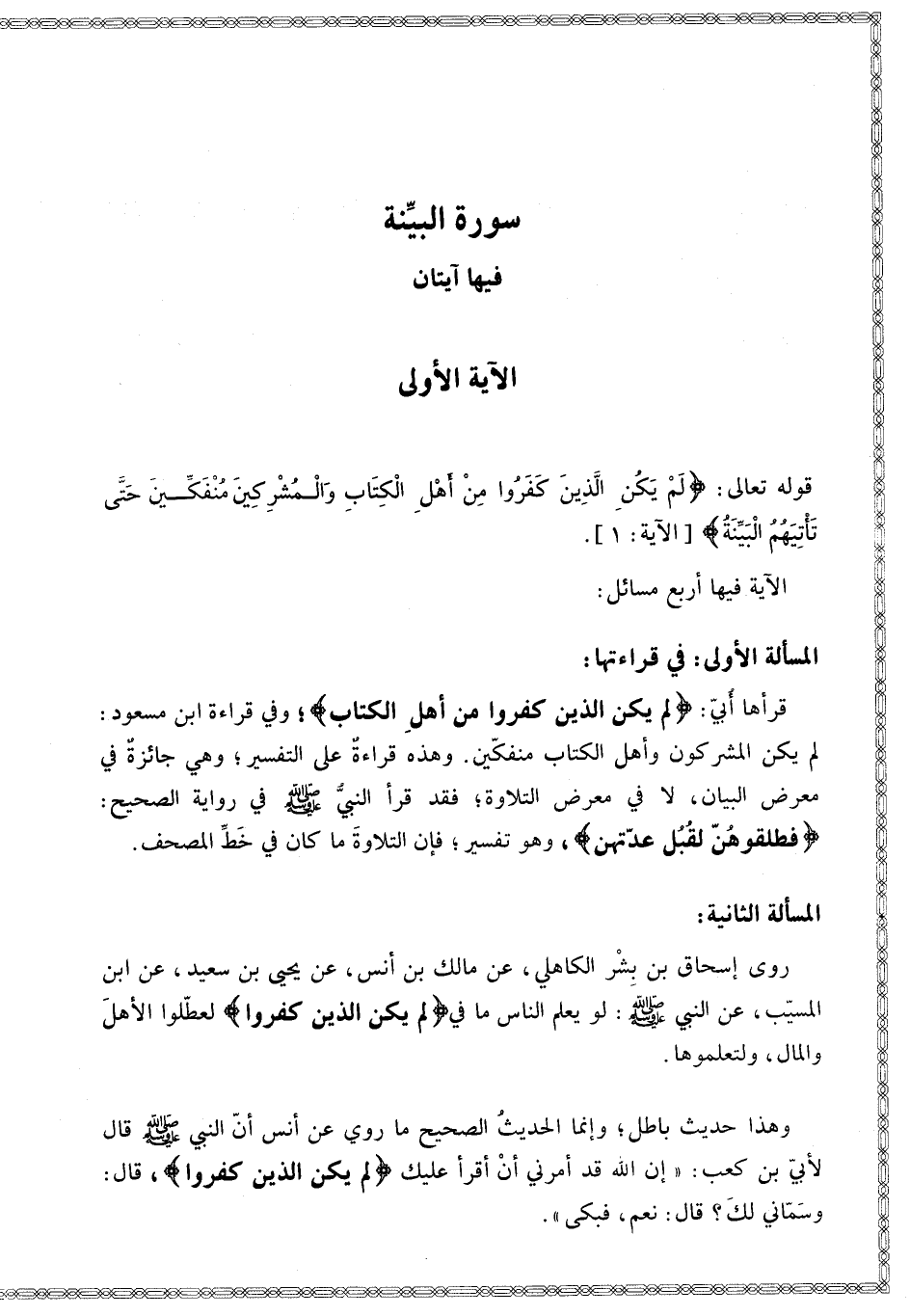 الْمَسْأَلَةُ الْأُولَى فِي قِرَاءَتِهَا: قَرَأَهَا أُبَيٌّ: {لَمْ يَكُنِ الَّذِينَ كَفَرُوا مِنْ أَهْلِ الْكِتَابِ} [البينة: 1]؛ وَفِي قِرَاءَةِ ابْنِ مَسْعُودٍ: لَمْ يَكُنِ الْمُشْرِكُونَ وَأَهْلُ الْكِتَابِ مُنْفَكِّينَ. وَهَذِهِ قِرَاءَةٌ عَلَى التَّفْسِيرِ؛ وَهِيَ جَائِزَةٌ فِي مَعْرِضِ الْبَيَانِ، لَا فِي مَعْرِضِ التِّلَاوَةِ؛ فَقَدْ قَرَأَ النَّبِيُّ - صَلَّى اللَّهُ عَلَيْهِ وَسَلَّمَ - فِي رِوَايَةِ الصَّحِيحِ: «فَطَلِّقُوهُنَّ لِقُبُلِ عِدَّتِهِنَّ»، وَهُوَ تَفْسِيرٌ؛ فَإِنَّ التِّلَاوَةَ مَا كَانَ فِي خَطِّ الْمُصْحَفِ.