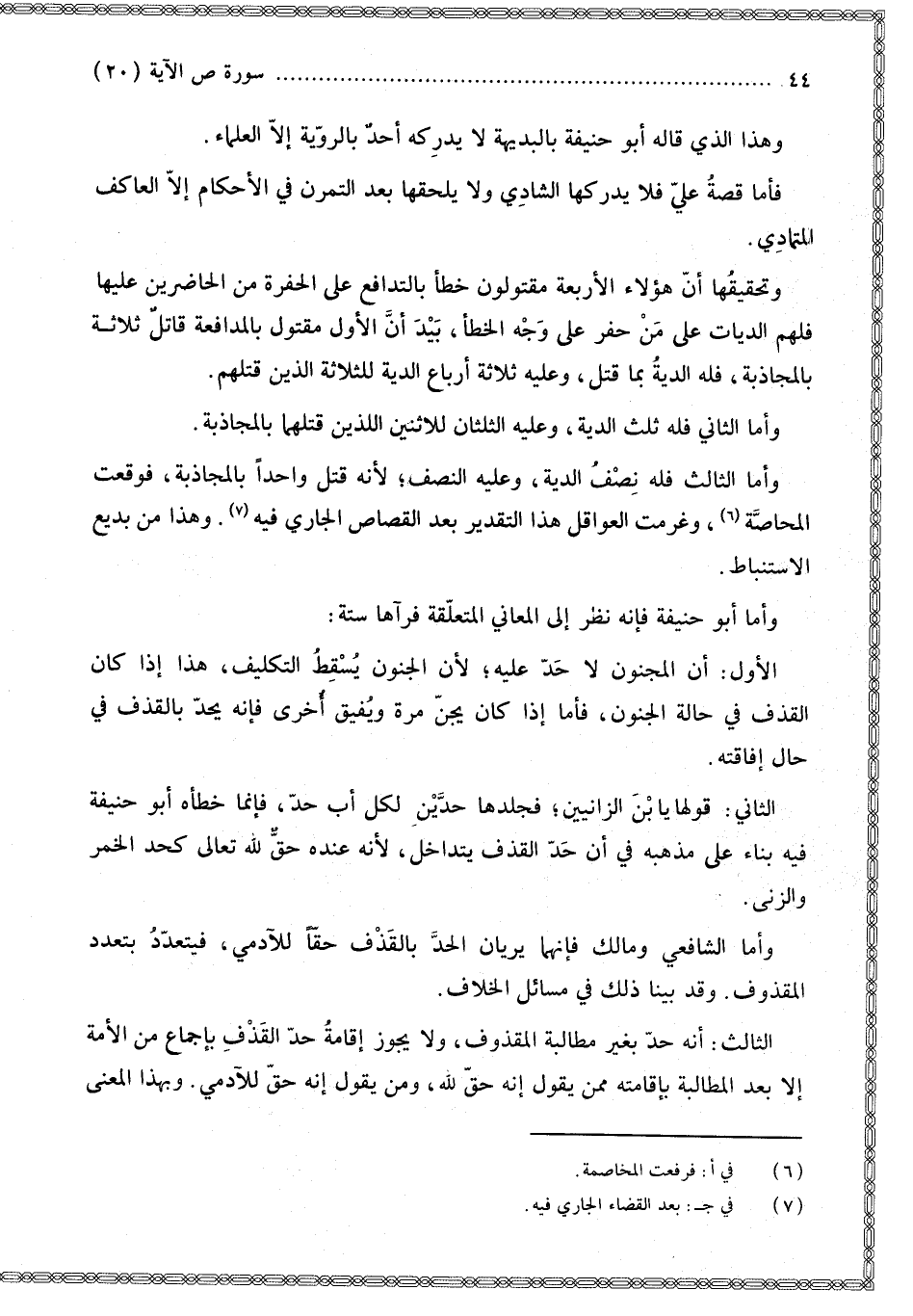 وَأَمَّا أَبُو حَنِيفَةَ فَإِنَّهُ نَظَرَ إلَى الْمَعَانِي الْمُتَعَلِّقَةِ فَرَآهَا سِتَّةً: الْأَوَّلُ: أَنَّ الْمَجْنُونَ لَا حَدَّ عَلَيْهِ؛ لِأَنَّ الْجُنُونَ يُسْقِطُ التَّكْلِيفَ، هَذَا إذَا كَانَ الْقَذْفُ فِي حَالَةِ الْجُنُونِ، فَأَمَّا إذَا كَانَ يُجَنُّ مَرَّةً وَيُفِيقُ أُخْرَى فَإِنَّهُ يُحَدُّ بِالْقَذْفِ فِي حَالِ إفَاقَتِهِ.