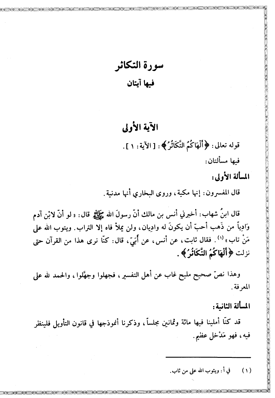 الْمَسْأَلَةُ الْأُولَى: قَالَ الْمُفَسِّرُونَ: إنَّهَا مَكِّيَّةٌ، وَرَوَى الْبُخَارِيُّ أَنَّهَا مَدَنِيَّةٌ. قَالَ ابْنُ شِهَابٍ: أَخْبَرَنِي أَنَسُ بْنُ مَالِكٍ أَنَّ رَسُولَ اللَّهِ - صَلَّى اللَّهُ عَلَيْهِ وَسَلَّمَ - قَالَ: «لَوْ أَنَّ لِابْنِ آدَمَ وَادِيًا مِنْ ذَهَبٍ أَحَبَّ أَنْ يَكُونَ لَهُ وَادِيَانِ، وَلَنْ يَمْلَأَ فَاهُ إلَّا التُّرَابُ. وَيَتُوبَ اللَّهُ عَلَى مَنْ تَابَ». فَقَالَ ثَابِتٌ عَنْ أَنَسٍ عَنْ أُبَيٍّ قَالَ: كُنَّا نَرَى هَذَا مِنْ الْقُرْآنِ حَتَّى نَزَلَتْ {أَلْهَاكُمُ التَّكَاثُرُ} [التكاثر: 1].