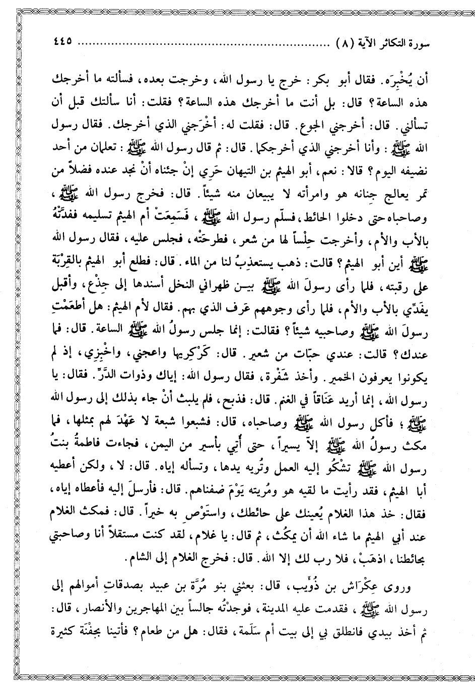 أَنْ يُخْبِرَهُ. فَقَالَ أَبُو بَكْرٍ: خَرَجَ يَا رَسُولَ اللَّهِ، وَخَرَجْت بَعْدَهُ، فَسَأَلْته مَا أَخْرَجَك هَذِهِ السَّاعَةَ؟ قَالَ: بَلْ أَنْتَ مَا أَخْرَجَك هَذِهِ السَّاعَةَ؟ فَقُلْت: أَنَا سَأَلْتُك قَبْلَ أَنْ تَسْأَلَنِي. قَالَ: أَخْرَجَنِي الْجُوعُ. قَالَ: فَقُلْت لَهُ: أَخْرَجَنِي الَّذِي أَخْرَجَك. فَقَالَ رَسُولُ اللَّهِ - صَلَّى اللَّهُ عَلَيْهِ وَسَلَّمَ -: وَأَنَا أَخْرَجَنِي الَّذِي أَخْرَجَكُمَا. قَالَ: ثُمَّ قَالَ رَسُولُ اللَّهِ - صَلَّى اللَّهُ عَلَيْهِ وَسَلَّمَ -: تَعْلَمَانِ مِنْ أَحَدٍ نُضِيفُهُ الْيَوْمَ؟ قَالَا: نَعَمْ، أَبُو الْهَيْثَمِ بْنِ التَّيْهَانِ حَرِيٌّ إنْ جِئْنَاهُ أَنْ نَجِدَ عِنْدَهُ فَضْلًا مِنْ تَمْرٍ يُعَالِجُ جِنَانَهُ هُوَ وَامْرَأَتُهُ لَا يَبِيعَانِ مِنْهُ شَيْئًا. قَالَ: فَخَرَجَ رَسُولُ اللَّهِ - صَلَّى اللَّهُ عَلَيْهِ وَسَلَّمَ - وَصَاحِبَاهُ حَتَّى دَخَلُوا الْحَائِطَ، فَسَلَّمَ رَسُولُ اللَّهِ - صَلَّى اللَّهُ عَلَيْهِ وَسَلَّمَ -، فَسَمِعَتْ أُمُّ الْهَيْثَمِ تَسْلِيمَهُ فَفَدَتْهُ بِالْأَبِ وَالْأُمِّ، وَأَخْرَجَتْ حِلْسًا لَهَا مِنْ شَعْرٍ، فَطَرَحَتْهُ، فَجَلَسَ عَلَيْهِ، فَقَالَ رَسُولُ اللَّهِ - صَلَّى اللَّهُ عَلَيْهِ وَسَلَّمَ -