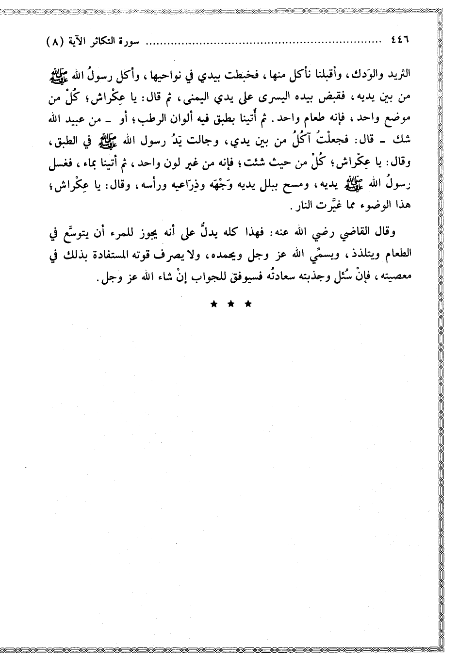 وَقَالَ الْقَاضِي - رَضِيَ اللَّهُ عَنْهُ -: فَهَذَا كُلُّهُ يَدُلُّ عَلَى أَنَّهُ يَجُوزُ لِلْمَرْءِ أَنْ يَتَوَسَّعَ فِي الطَّعَامِ وَيَتَلَذَّذَ، وَيُسَمِّيَ اللَّهَ عَزَّ وَجَلَّ وَيَحْمَدَهُ، وَلَا يَصْرِفَ قُوَّتَهُ الْمُسْتَفَادَةَ بِذَلِكَ فِي مَعْصِيَتِهِ، فَإِنْ سُئِلَ وَجَذَبَتْهُ سَعَادَتُهُ فَسَيُوَفَّقُ لِلْجَوَابِ إنْ شَاءَ اللَّهُ عَزَّ وَجَلَّ.