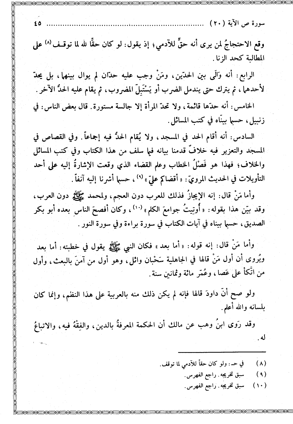 السَّادِسُ أَنَّهُ أَقَامَ الْحَدَّ فِي الْمَسْجِدِ، وَلَا يُقَامُ الْحَدُّ فِيهِ إجْمَاعًا. وَفِي الْقِصَاصِ فِي الْمَسْجِدِ وَالتَّعْزِيرِ فِيهِ خِلَافٌ قَدَّمْنَا بَيَانَهُ فِيمَا سَلَفَ مِنْ هَذَا الْكِتَابِ وَفِي كُتُبِ الْمَسَائِلِ وَالْخِلَافِ؛ فَهَذَا هُوَ فَصْلُ الْخِطَابِ وَعِلْمُ الْقَضَاءِ الَّذِي وَقَعَتْ الْإِشَارَةُ إلَيْهِ عَلَى أَحَدِ التَّأْوِيلَاتِ فِي الْحَدِيثِ الْمَرْوِيِّ: «أَقَضَاكُمْ عَلِيٌّ»، حَسْبَمَا أَشَرْنَا إلَيْهِ آنِفًا.