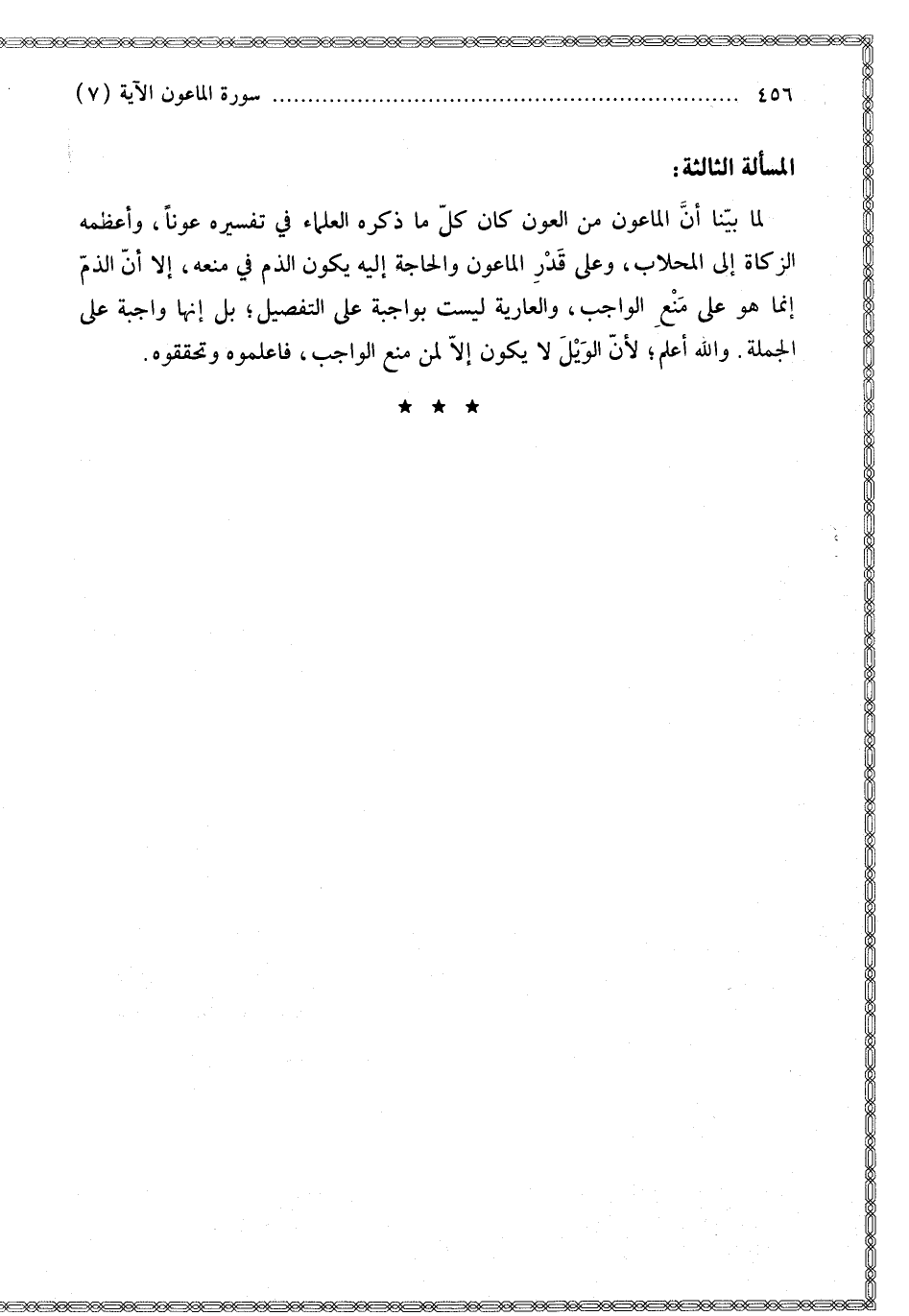 الْمَسْأَلَةُ الثَّالِثَةُ لَمَّا بَيَّنَّا أَنَّ الْمَاعُونَ مِنْ الْعَوْنِ كَانَ كُلُّ مَا ذَكَرَهُ الْعُلَمَاءُ فِي تَفْسِيرِهِ عَوْنًا، وَأَعْظَمُهُ الزَّكَاةُ إلَى الْمِحْلَابِ، وَعَلَى قَدْرِ الْمَاعُونِ وَالْحَاجَةِ إلَيْهِ يَكُونُ الذَّمُّ فِي مَنْعِهِ، إلَّا أَنَّ الذَّمَّ إنَّمَا هُوَ عَلَى مَنْعِ الْوَاجِبِ، وَالْعَارِيَّةُ لَيْسَتْ بِوَاجِبَةٍ عَلَى التَّفْصِيلِ؛ بَلْ إنَّهَا وَاجِبَةٌ عَلَى الْجُمْلَةِ. وَاَللَّهُ أَعْلَمُ؛ لِأَنَّ الْوَيْلَ لَا يَكُونُ إلَّا لِمَنْ مَنَعَ الْوَاجِبَ، فَاعْلَمُوهُ وَتَحَقَّقُوهُ.