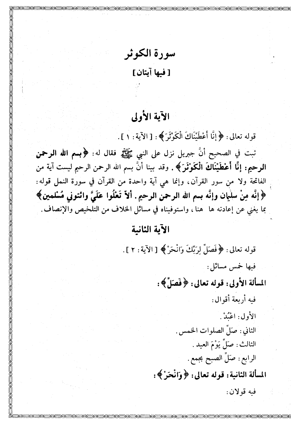 ِ] الْآيَةُ الْأُولَى قَوْله تَعَالَى: {إِنَّا أَعْطَيْنَاكَ الْكَوْثَرَ} [الكوثر: 1]: ثَبَتَ فِي الصَّحِيحِ «أَنَّ جِبْرِيلَ نَزَلَ عَلَى النَّبِيِّ - صَلَّى اللَّهُ عَلَيْهِ وَسَلَّمَ - فَقَالَ لَهُ: بِسْمِ اللَّهِ الرَّحْمَنِ الرَّحِيمِ {إِنَّا أَعْطَيْنَاكَ الْكَوْثَرَ} [الكوثر: 1]». وَقَدْ بَيَّنَّا أَنَّ بِسْمِ اللَّهِ الرَّحْمَنِ الرَّحِيمِ لَيْسَتْ آيَةً مِنْ الْفَاتِحَةِ وَلَا مِنْ سُوَرِ الْقُرْآنِ، وَإِنَّمَا هِيَ وَاحِدَةٌ مِنْ الْقُرْآنِ فِي سُورَةِ النَّمْلِ قَوْلُهُ: {إِنَّهُ مِنْ سُلَيْمَانَ وَإِنَّهُ بِسْمِ اللَّهِ الرَّحْمَنِ الرَّحِيمِ} [النمل: 30] {أَلا تَعْلُوا عَلَيَّ وَأْتُونِي مُسْلِمِينَ} [النمل: 31] بِمَا يُغْنِي عَنْ إعَادَتِهِ هَاهُنَا، وَاسْتَوْفَيْنَاهُ فِي مَسَائِلِ الْخِلَافِ مِنْ التَّلْخِيصِ وَالْإِنْصَافِ.