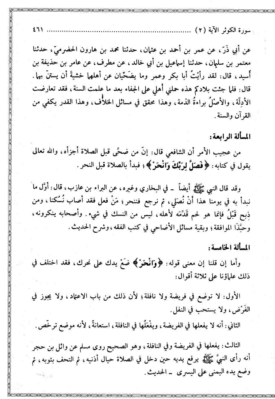 الْمَسْأَلَةُ الْخَامِسَةُ وَأَمَّا [إنْ قُلْنَا] إنَّ مَعْنَى قَوْلِهِ: {وَانْحَرْ} [الكوثر: 2] ضَعْ يَدَك عَلَى نَحْرِك، فَقَدْ اخْتَلَفَ فِي ذَلِكَ عُلَمَاؤُنَا عَلَى ثَلَاثَةِ أَقْوَالٍ: الْأَوَّلِ لَا تُوضَعُ فِي فَرِيضَةٍ وَلَا نَافِلَةٍ؛ لِأَنَّ ذَلِكَ مِنْ بَابِ الِاعْتِمَادِ، وَلَا يَجُوزُ فِي الْفَرْضِ، وَلَا يُسْتَحَبُّ فِي النَّفْلِ.