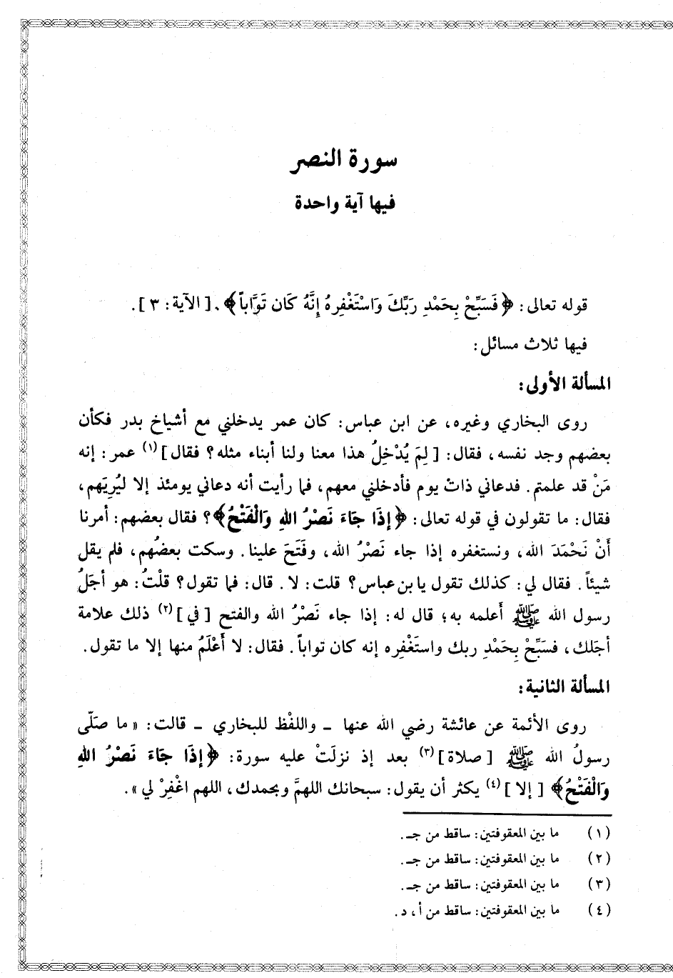 الْمَسْأَلَةُ الْأُولَى رَوَى الْبُخَارِيُّ وَغَيْرُهُ، عَنْ ابْنِ عَبَّاسٍ: كَانَ عُمَرُ يُدْخِلُنِي مَعَ أَشْيَاخِ بَدْرٍ فَكَأَنَّ بَعْضَهُمْ وَجَدَ نَفْسَهُ، فَقَالَ: لِمَ يَدْخُلُ هَذَا مَعَنَا وَلَنَا أَبْنَاءٌ مِثْلُهُ؟ فَقَالَ عُمَرُ: إنَّهُ مَنْ قَدْ عَلِمْتُمْ. فَدَعَانِي ذَاتَ يَوْمٍ فَأَدْخَلَنِي مَعَهُمْ، فَمَا رَأَيْت أَنَّهُ دَعَانِي يَوْمَئِذٍ إلَّا لِيُرِيَهُمْ، فَقَالَ: مَا تَقُولُونَ فِي قَوْله تَعَالَى: {إِذَا جَاءَ نَصْرُ اللَّهِ وَالْفَتْحُ} [النصر: 1]؟ فَقَالَ بَعْضُهُمْ: أُمِرْنَا أَنْ نَحْمَدَ اللَّهَ، وَنَسْتَغْفِرَهُ إذَا جَاءَ نَصْرُ اللَّهِ، وَفَتَحَ عَلَيْنَا. وَسَكَتَ بَعْضُهُمْ، فَلَمْ يَقُلْ شَيْئًا. فَقَالَ لِي: كَذَلِكَ تَقُولُ يَا ابْنَ عَبَّاسٍ؟ قُلْت: لَا. قَالَ: فَمَا تَقُولُ؟ قُلْت: هُوَ أَجَلُ رَسُولِ اللَّهِ - صَلَّى اللَّهُ عَلَيْهِ وَسَلَّمَ - أَعْلَمَهُ بِهِ؛ قَالَ لَهُ: {إِذَا جَاءَ نَصْرُ اللَّهِ وَالْفَتْحُ} [النصر: 1] فِي ذَلِكَ عَلَامَةُ أَجَلِك، فَسَبِّحْ بِحَمْدِ رَبِّك وَاسْتَغْفِرْهُ إنَّهُ كَانَ تَوَّابًا. فَقَالَ: لَا أَعْلَمُ مِنْهَا إلَّا مَا تَقُولُ.