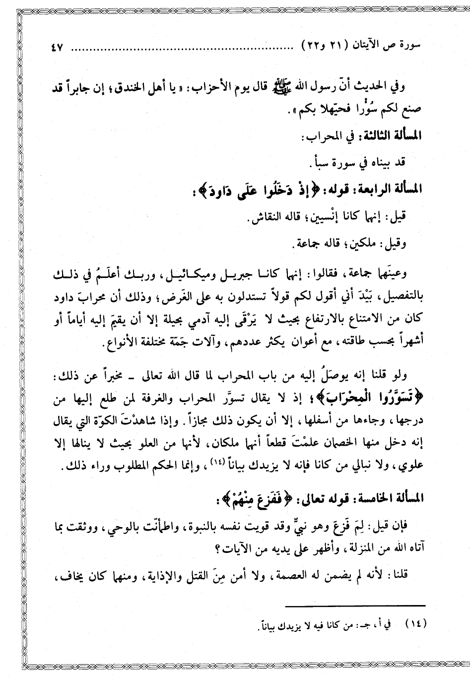 وَعَيَّنَهُمَا جَمَاعَةٌ، فَقَالُوا: إنَّهُمَا كَانَا جِبْرِيلَ وَمِيكَائِيلَ، وَرَبُّك أَعْلَمُ فِي ذَلِكَ بِالتَّفْصِيلِ، بَيْدَ أَنِّي أَقُولُ لَكُمْ قَوْلًا تَسْتَدِلُّونَ بِهِ عَلَى الْغَرَضِ؛ وَذَلِكَ أَنَّ مِحْرَابَ دَاوُد كَانَ مِنْ الِامْتِنَاعِ بِالِارْتِفَاعِ بِحَيْثُ لَا يَرْقَى إلَيْهِ آدَمِيٌّ بِحِيلَةٍ إلَّا أَنْ يُقِيمَ إلَيْهِ أَيَّامًا أَوْ أَشْهُرًا بِحَسْبِ طَاقَتِهِ، مَعَ أَعْوَانٍ يَكْثُرُ عَدَدُهُمْ، وَآلَاتٍ جَمَّةٍ مُخْتَلِفَةِ الْأَنْوَاعِ.
