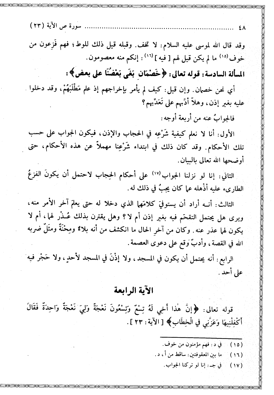 الْمَسْأَلَةُ السَّادِسَةُ قَوْلُهُ: {خَصْمَانِ بَغَى بَعْضُنَا عَلَى بَعْضٍ} [ص: 22]: أَيْ نَحْنُ خَصْمَانِ. وَإِنْ قِيلَ: كَيْفَ لَمْ يَأْمُرْ بِإِخْرَاجِهِمْ إذْ عَلِمَ مَطْلَبَهُمْ، وَقَدْ دَخَلُوا عَلَيْهِ بِغَيْرِ إذْنٍ، وَهَلَّا أَدَّبَهُمْ عَلَى تَعَدِّيهِمْ؟ فَالْجَوَابُ عَنْهُ مِنْ أَرْبَعَةِ أَوْجُهٍ: الْأَوَّلُ: أَنَّا لَا نَعْلَمُ كَيْفِيَّةَ شَرْعِهِ فِي الْحِجَابِ وَالْإِذْنِ، فَيَكُونُ الْجَوَابُ عَلَى حَسْبِ تِلْكَ الْأَحْكَامِ. وَقَدْ كَانَ ذَلِكَ فِي ابْتِدَاءِ شَرْعِنَا مُهْمَلًا عَنْ هَذِهِ الْأَحْكَامِ، حَتَّى أَوْضَحَهَا اللَّهُ تَعَالَى بِالْبَيَانِ.