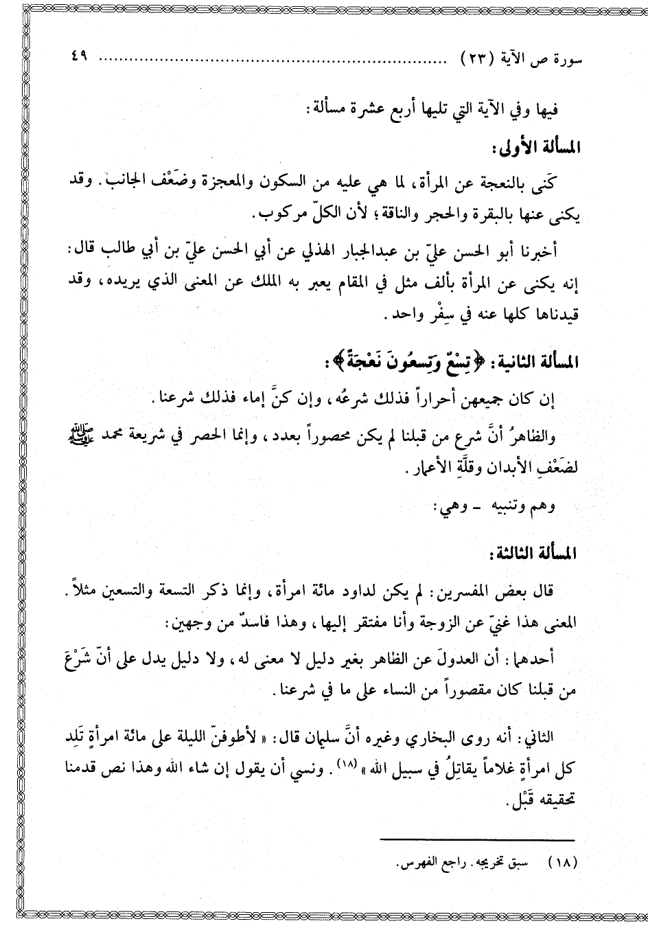 وَهْمٌ وَتَنْبِيهٌ وَهِيَ: الْمَسْأَلَةُ الثَّالِثَةُ قَالَ بَعْضُ الْمُفَسِّرِينَ: لَمْ يَكُنْ لِدَاوُدَ مِائَةُ امْرَأَةٍ، وَإِنَّمَا ذَكَرَ التِّسْعَةَ وَالتِّسْعِينَ