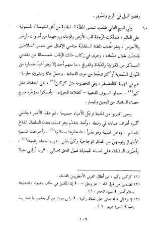 وفي اليوم التالي طلعت شمس المظلّة السلطانية من أفق الخيمة/ المستولية على العالم، فتملّكت الرّجفة قلب الأرض والزمان وروحهما من أصوات المزامير والأجراس، ونشر عقاب المظلة السلطانيّة جناحي الإقبال على شمس السلاطين فامتدّت ظلال السّعادة، وجرى في ركاب مالك الرّقاب خمسمائة من مقدمي العساكر من القزاونة والدّيالمة والفرنج، ما منهم أحد إلا وهو أشدّ جسارة من النّوازل السّماوية أو أكثر تبجّحا من موت الفجاءة. وحمل مائة وعشرون حارسا- هم في الهيبة كالغضنفر، وفي الخصومة مثل كركين (¬1)، وفي الحفاظ مثل كيو (1) - حملوا السيوف الذهبية- كقلادة الجوزاء- وأمسكوا بمؤخّرة سرج حصان السلطان من اليمين واليسار.