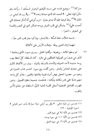 مُبارَكاً» (¬1)، ووضع قدمه على مسند التّوفيق [وعرش الملك]، وأخذ يتلو مكرّرا قوله تعالى: الْحَمْدُ لِلَّهِ الَّذِي صَدَقَنا وَعْدَهُ (¬2)، ورَبِّ قَدْ آتَيْتَنِي مِنَ الْمُلْكِ (¬3) وعدّ فرضا عليه أن يدعو بعبارة: «رب أوزعني أن أشكر نعمتك التي أنعمت عليّ» (¬4) وتمكّن في قلب العرش وروحه تمكّن النور في البصر والقيمة في الجوهر، (شعر):