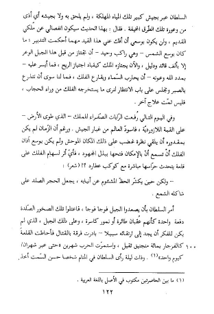 السلطان عبر بجيش كبير تلك المياه المهلكة، ولم يلحق به ولا بجيشه أي أذى من وعورة تلك الطّرق المخيفة. فقال: بهذا الحديث سيكون انفصالي عن ملكي القديم، ولن يكون بوسعي أن أفك عني هذا القيد مهما أحكمت التدبير؛ ما كان بوسع الشمس- وهي راكب وحيد- أن تجتاز من قبل هذا الجبل الوعر إلا بألف قائد ودليل، والآن يجتازه الملك كيقباد اجتياز الريح، فما أيسر عليه- بمدد الله وعونه- أن يحارب السّماء ويقارع الفلك، فما لنا سوى أن نتذرع بالصبر ونجلس على باب الانتظار لنرى ما يستخرجه الفلك من وراء الحجاب، فليس ثمّت علاج آخر.