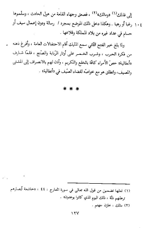 ولما بلغ خبر الفتح الثّاني سمع المليك أقام الاحتفالات العامة، وأفرغ ذهنه من فكرة الحرب، وشرب الخمر على أوتار الرّبابة والصّنج، فلمّا شارف «أنطالية» خصّ الأمراء كافّة بالخلع والتّكريم، وأذن لهم بالانصراف إلى المشتى والمصيف، وانطلق هو مع خواصّه لقضاء الصّيف في «أنطالية».