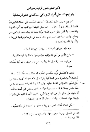لكنها «كالنّصل عرّي متناه من الخلل» قد عطلت من حلل السّور، قال السلطان لأمراء الدولة: من الخطأ البالغ ترك مثل هذه المدينة الشّهيرة معطّلة من حلل السّور كالعرائس الفاتنة المجلوّة. ولئن كانت/ الدنيا- بسبب ما لنا من همّة مظفرة وسنان فتّاك- تعدّ سورا حولنا، فالحزم يقتضي ممّن يتّصف بالدّهاء أن يكون على حذر دائم من الجشع والطّمع، فدورة الأيام لا تدوم على وتيرة، والزمان مولّد للحادثات، والشّمس جالبة للواقعات، (بيت):