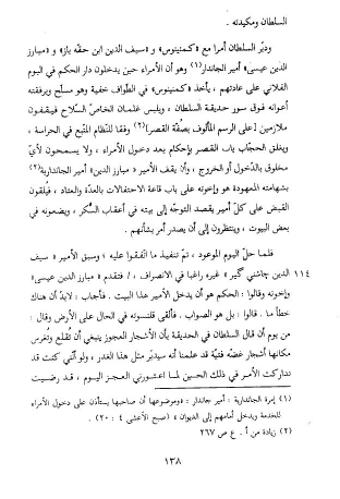 ودبّر السلطان أمرا مع «كمنينوس» و «سيف الدين ابن حقّه باز» و «مبارز الدين عيسى» أمير الجاندار (¬1) وهو أن الأمراء حين يدخلون دار الحكم في اليوم الفلاني على عادتهم، يأخذ «كمنينوس» في الطّواف خفية وهو مسلّح وبرفقته أعوانه فوق سور حديقة السلطان، ويلبس غلمان الخاصّ السّلاح فيقفون ملازمين [على الرسم المألوف بصفّة القصر] (¬2) وفقا للنّظام المتّبع في الحراسة، ويغلق الحجّاب باب القصر بإحكام بعد دخول الأمراء، ولا يسمحون لأيّ مخلوق بالدّخول أو الخروج، وأن يقف الأمير «مبارز الدين» أمير الجاندارية (2) بشهامته المعهودة هو وإخوته على باب قاعة الاحتفالات بالعدّة والعتاد، فيلقون القبض على كلّ أمير يقصد التوجّه إلى بيته في أعقاب السّكر، ويضعونه في بعض البيوت، وينتظرون إلى أن يصدر أمر بشأنهم.
