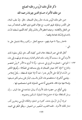أطال الله في عمر السلطان علاء الدين كيقباد ألف عام. ليكن معلوما لملك الأمراء أنني مذ سمعت أنّ رايات ملك العالم الغالبة وجيشه قد توجّهت إلى هذه/ النواحي، اضطربت الروح في جسدي، وأنا لا أدري ما الأمر؟ ومن الخصم والمنازع؟ فإن كان جيش القبجاق قد وقع بحماقته في الضّلالة، وأهرقوا الكثير من الدّماء الزكيّة على الأرض هدرا، فما أنا إلا مملوك للسلطان، بكلّ إخلاص ويقيني أنكم إن استخلصتم هذه الدّيار بالسيف البتّار فلن يسلم لكم ضبطها وإصلاحها دون قائد، فاعتبروني أنا نفسي المملوك الذي استعملتموه لها.
