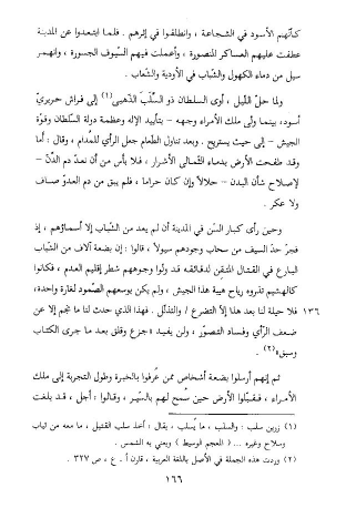 كأنّهم الأسود في الشجاعة، وانطلقوا في إثرهم. فلما ابتعدوا عن المدينة عطفت عليهم العساكر المنصورة، وأعملت فيهم السّيوف الجسورة، وانهمر سيل من دماء الكهول والشّباب في الأودية والشّعاب.