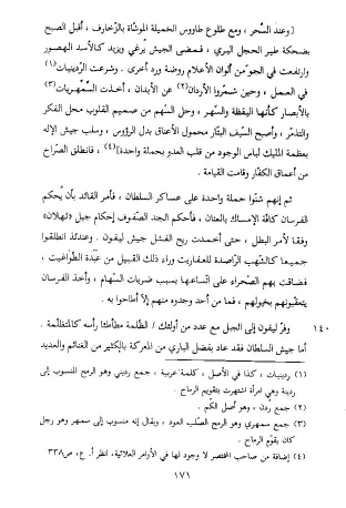[وعند السّحر، ومع طلوع طاووس الخميلة الموشّاة بالزّخارف، أقبل الصبح بضحكة طير الحجل البري، فمضى الجيش يرغي ويزبد كالأسد الهصور وارتفعت في الجوّ من ألوان الأعلام روضة ورد أخرى. وشرعت الرّدينيات (¬1) في العمل، وحين شمّروا الأردان (¬2) عن الأبدان، أخذت السّمهريات (¬3) بالأبصار كأنها اليقظة والسّهر، وحل السّهم من صميم القلوب محل الفكر والتذمّر، وأصبح السّيف البتّار محمول الأعناق بدل الرؤوس، وسلب جيش الإله بعظمة المليك لباس الوجود من قلب العدو بحملة واحدة] (¬4)، فانطلق الصّراخ من أعماق الكفّار وقامت القيامة.