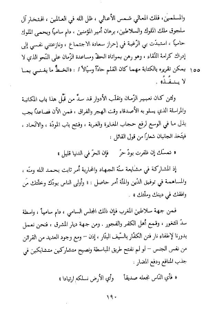 فمن جهة سلاطين المغرب فإن ذلك المجلس السامي، دام ساميا، واسطة سدّ الثغور، وقمع أهل الكفر والفجور. ومن جهة ديار المشرق، فنحن نعمل بدورنا لإطفاء نار فتن الكفّار بالسّيف البتّار، إذن- ومع وجود العديد من القرائن من نفس الجنس- لو لم نفتح طريق المباسطة ونصبح متشاركين متشابكين في جذب المنافع ودفع المضار: