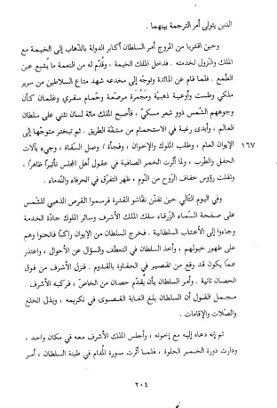 وحين اقتربا من المروج أمر السلطان أكابر الدولة بالذّهاب إلى الخيمة مع الملك والنّزول لخدمته. فدخل الملك الخيمة، وقدّم له من النعمة ما يشبع عين الطّمع. فلما قام عن المائدة وتوجّه إلى مخدعه شهد متاع السلاطين من سرير ملكي وطست وأوعية ذهبيّة ومجمرة مرصّعة وحّمام سفري وغلمان كأن وجوههم الشّمس ذوو شعر مسكيّ، فأصبح الملك مائة لسان تثني على سلطان العالم، وأبدى رغبة في الاستحمام من مشقّة الطريق. ثم تبختر متوجّها إلى الإيوان العام، وطلب الملوك والإخوان، وفجأة/ وصل السّقاة، وجيء بآلات الحفل والطّرب، ولما أثّرت الخمر الصافية في عقول أهل المجلس تأثيرا ظاهرا، وثقلت رؤوس خفاف الرّوح من النّوم، ظهر التفرّق في الحرفاء والنّدماء.