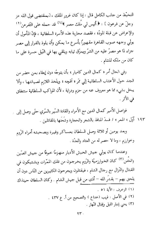 وعندما كان يولي جيش الحبش الأدبار منهزما خوفا من جيش الصّين والختن (¬3) كان الخوارزميّة والرّوم يخرجون من تلك الممّرات ويشتبكون في القتال والنّزال مع رجال الشام، فيقتلون ويجرحون الكثيرين من النّاس دون أن يلحق بهم- بقدر الله- أذى من قبل جيش الشام. وكان السلطان حينذاك