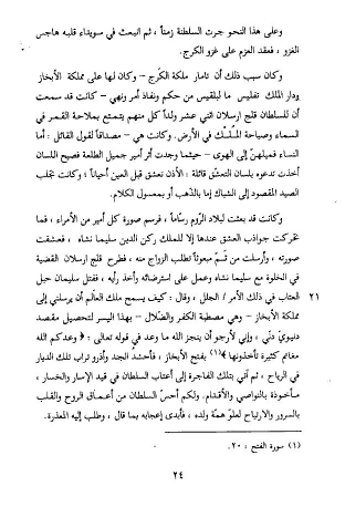 وكانت قد بعثت لبلاد الرّوم رسّاما، فرسم صورة كل أمير من الأمراء، فما تحركت جواذب العشق عندها إلا للملك ركن الدين سليمانشاه، فعشقت صورته، وأرسلت من ثمّ مبعوثا تطلب الزواج منه، فطرح قلج ارسلان القضية في الخلوة مع سليمانشاه وعمل على استرضائه وأخذ رأيه، ففتل سليمان حبل العتاب في ذلك الأمر/ الجلل، وقال: كيف يسمح ملك العالم أن يرسلني إلى مملكة الأبخاز- وهي مصطبة الكفر والضّلال- بهذا اليسر لتحصيل مقصد دنيويّ دنيّ، وإني لأرجو أن ينجز الله ما وعد في قوله تعالى: وَعَدَكُمُ اللَّهُ مَغانِمَ كَثِيرَةً تَأْخُذُونَها (¬1) بفتح الأبخاز، فأحشد الجند وأذرو تراب تلك الديار في الرياح، ثم آتي بتلك الفاجرة إلى أعتاب السلطان في قيد الإسار والخسار، مأخوذة بالنواصي والأقدام. ولكم أحسّ السلطان من أعماق الروح والقلب بالسرور والارتياح لعلوّ همّة ولده، فأبدى إعجابه بما قال، وطلب إليه المعذرة.