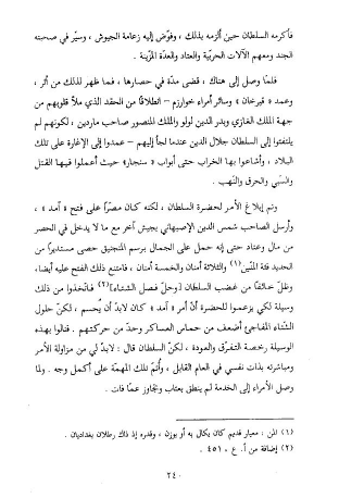 وتم إبلاغ الأمر لحضرة السلطان، لكنه كان مصّرا على فتح «آمد»، وأرسل الصاحب شمس الدين الإصبهاني بجيش آخر مع ما لا يدخل في الحصر من مال وعتاد حتى إنه حمل على الجمال برسم المنجنيق حصى مستديرا من الحديد فئة المنّين (¬1) والثلاثة أمنان والخمسة أمنان، فامتنع ذلك الفتح عليه أيضا، وظلّ خائفا من غضب السلطان [وحلّ فصل الشتاء] (¬2) فاتّخذوا من ذلك وسيلة لكي يزعموا للحضرة أنّ أمر «آمد» كان لابدّ أن يحسم، لكنّ حلول الشّتاء المفاجئ أضعف من حماس العساكر وحدّ من حركتهم. فنالوا بهذه الوسيلة رخصة التفرّق والعودة، لكنّ السلطان قال: لابدّ لي من مزاولة الأمر ومباشرته بذات نفسي في العام القابل، وأتمّ تلك المهمّة على أكمل وجه. ولما وصل الأمراء إلى الخدمة لم ينطق بعتاب وتجاوز عمّا فات.