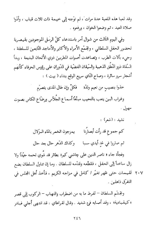 وفي اليوم الثّالث من شوال أمر باستدعاء كلّ الرسل الموجودين بقيصرية لحضور الحفل السلطاني، وتجمّع الأمراء والأكابر والأماجد التّابعين للسلطنة، وجيء بآلات الطرب، وتصاعدت أصوات المطربين ذوي الألحان البديعة، وبدأ السّقاة ذوو النّطق الذهبية والسّيقان الفضّية في الدّوران على رؤوس الحرفاء كأنهم أشجار سرو سائرة، وصاح النّاي سريع الوقع بنداء (بيت):