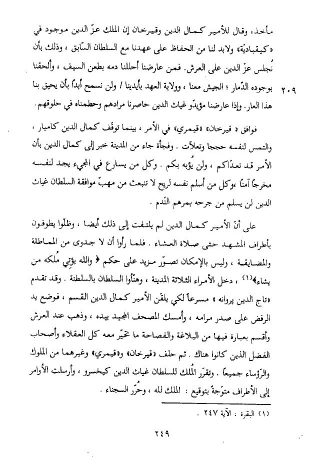مأخذ، وقال للأمير كمال الدين وقيرخان إن الملك عزّ الدين موجود في «كيقباديّة» ولابد لنا من الحفاظ على عهدنا مع السلطان السّابق، وذلك بأن نجلس عزّ الدين على العرش. فمن عارضنا أحللنا دمه بطعن السيف، وألحقنا بوجوده الدّمار؛ الجيش معنا، وولاية العهد بأيدينا/ ولن نسمح أبدا بأن يحيق بنا هذا العار. وإذا عارضنا مؤيدّو غياث الدين حاصرنا مرادهم وحطمناه في حلوقهم.