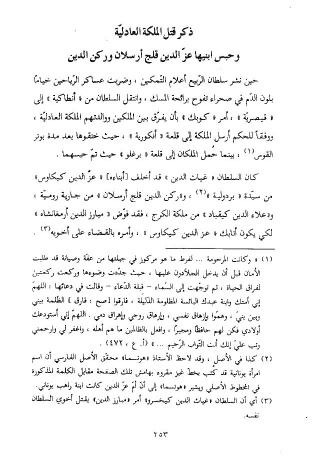 (¬2) كذا في الأصل، وقد لاحظ الأستاذ «هوتسما» محقّق الأصل الفارسي أن اسم امرأة يونانية قد كتب بخطّ غير مقروء بهامش تلك الصفحة مقابل الكلمة المذكورة في المخطوط الأصلي ويشير «هوتسما» إلى أنّ أمّ عزّ الدين كانت ابنة راهب يوناني.