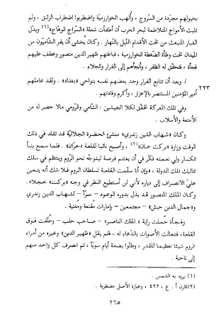 بخيولهم مجرّدة من السّروج، وألهب الخوارزميّة واضطربوا اضطراب الزئبق، ولم تلبث الأمواج المتلاطمة لبحر الحرب أن أطفأت شعلة «السّراج الوهّاج» (¬1) وبدّل الغبار المنبعث من تحت الأقدام اللّيل بالنّهار. وكان يخشى أن يفر الشّاميّون من الميدان تحت وطأة الضّغطة الخوارزمية، فباغتهم ظهير الدين منصور وعطف عليهم فجأة، فتحقّق له الظفر، وألجأهم إلى الفرار والجلاء.