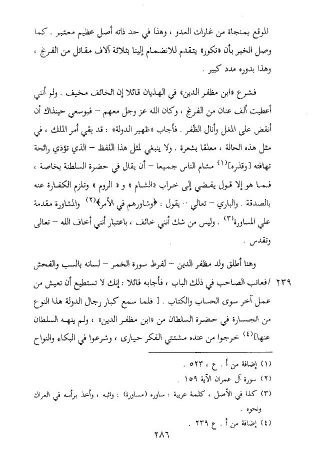 فشرع «ابن مظفر الدين» في الهذيان قائلا إن الخائف مخيف. ولو أنني أعطيت ألف عنان من الفرنج، وكان الله عز وجل معهم- فبوسعي حينذاك أن أنقض على المغل وأنال الظّفر. فأجاب «ظهير الدولة»: قد بقي أمر الملك، في مثل هذه الحالة، معلقا بشعرة. ولا ينبغي لمثل هذا اللفظ- الذي تؤذي رائحة تهافته [وقذره] (¬1) مشام الناس جميعا- أن يقال في حضرة السلطنة بخاصة، فما هو إلا قول يفضي إلى خراب «الشام» و «الروم» وتلزم الكفارة عنه بالصدقة. والباري- تعالي- يقول: وَشاوِرْهُمْ فِي الْأَمْرِ (¬2) والمشاورة مقدمة علي المساورة (¬3). وليس من شك أنني خائف، باعتبار أنني أخاف الله- تعالى وتقدس.
